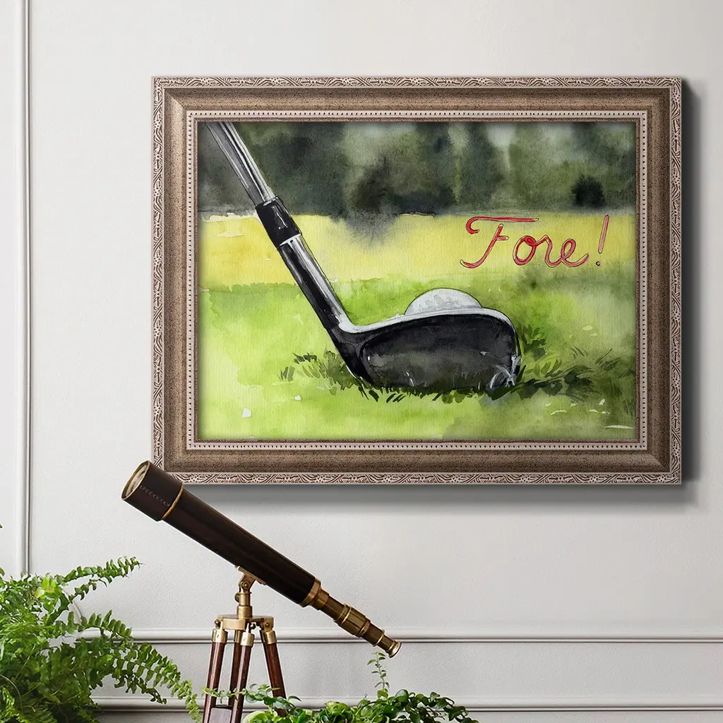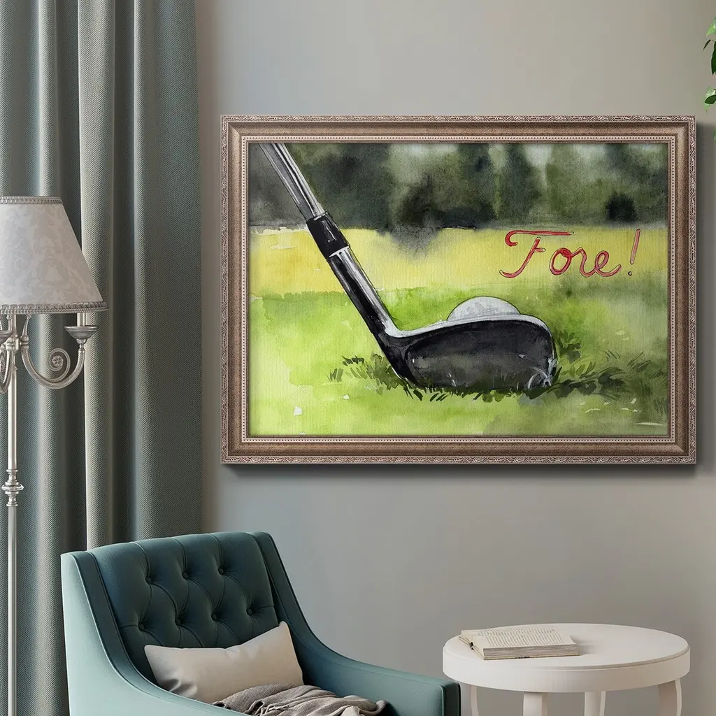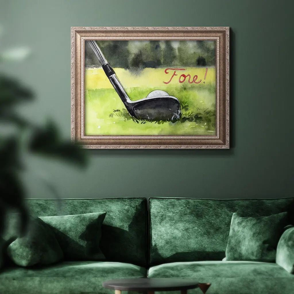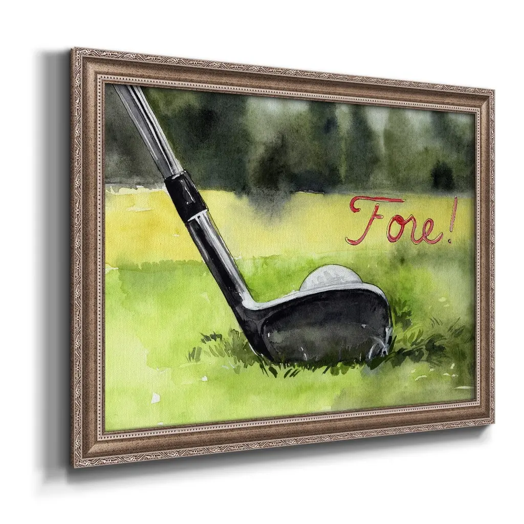 Tee Off Time IV Premium Framed Canvas- Ready to Hang A Premium Framed Canvas created to last. Framed in distressed wood and available in an array of sizes and colors Featuring a beveled a solid wood stretcher bar, each piece comes ready to hand 3 SIZES AVAILABLE 16''X20'' - Overall Size 18'X27'' - Overall Size 24''x36'' - Overall Size Each piece is made to order. Each piece comes with hanging hardware. Made in the USA Ready to Hang Giclee Paper Print Acrylic Glass Beveled Matt Board