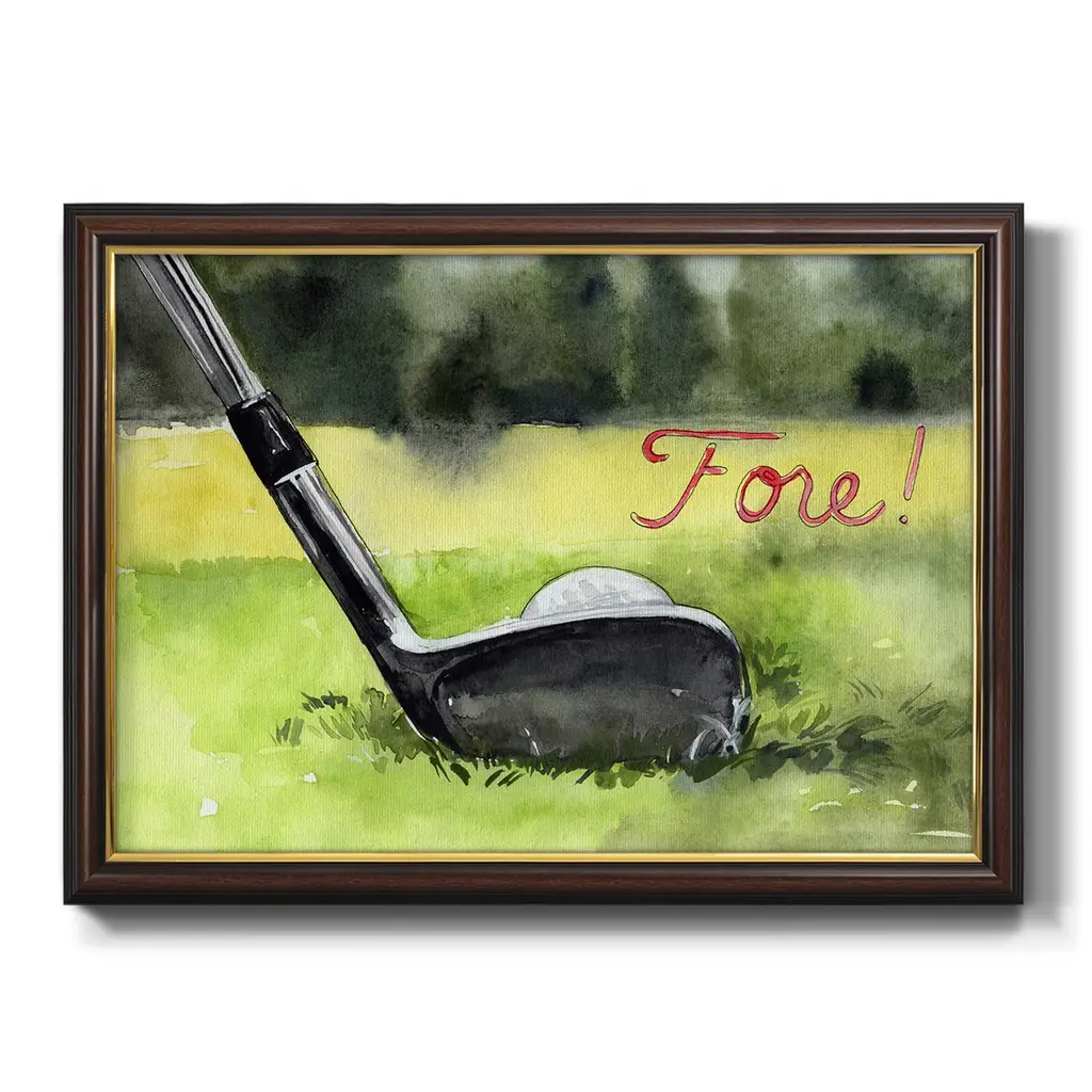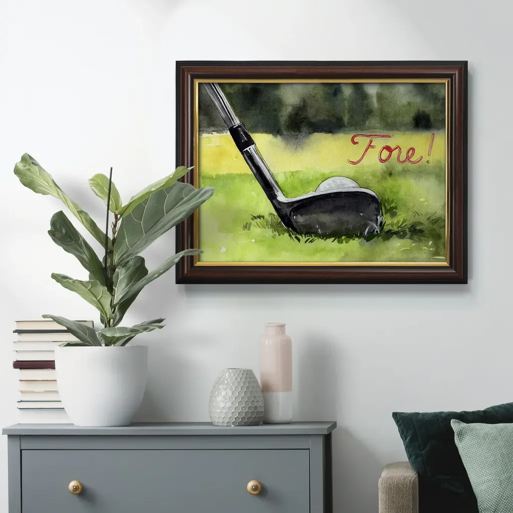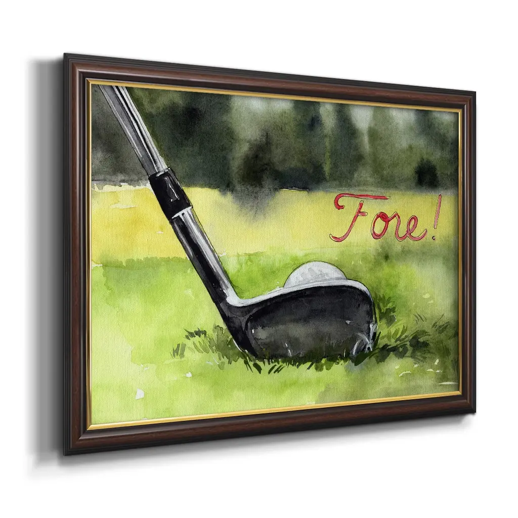 Tee Off Time IV Premium Framed Canvas- Ready to Hang A Premium Framed Canvas created to last. Framed in distressed wood and available in an array of sizes and colors Featuring a beveled a solid wood stretcher bar, each piece comes ready to hand 3 SIZES AVAILABLE 16''X20'' - Overall Size 18'X27'' - Overall Size 24''x36'' - Overall Size Each piece is made to order. Each piece comes with hanging hardware. Made in the USA Ready to Hang Giclee Paper Print Acrylic Glass Beveled Matt Board