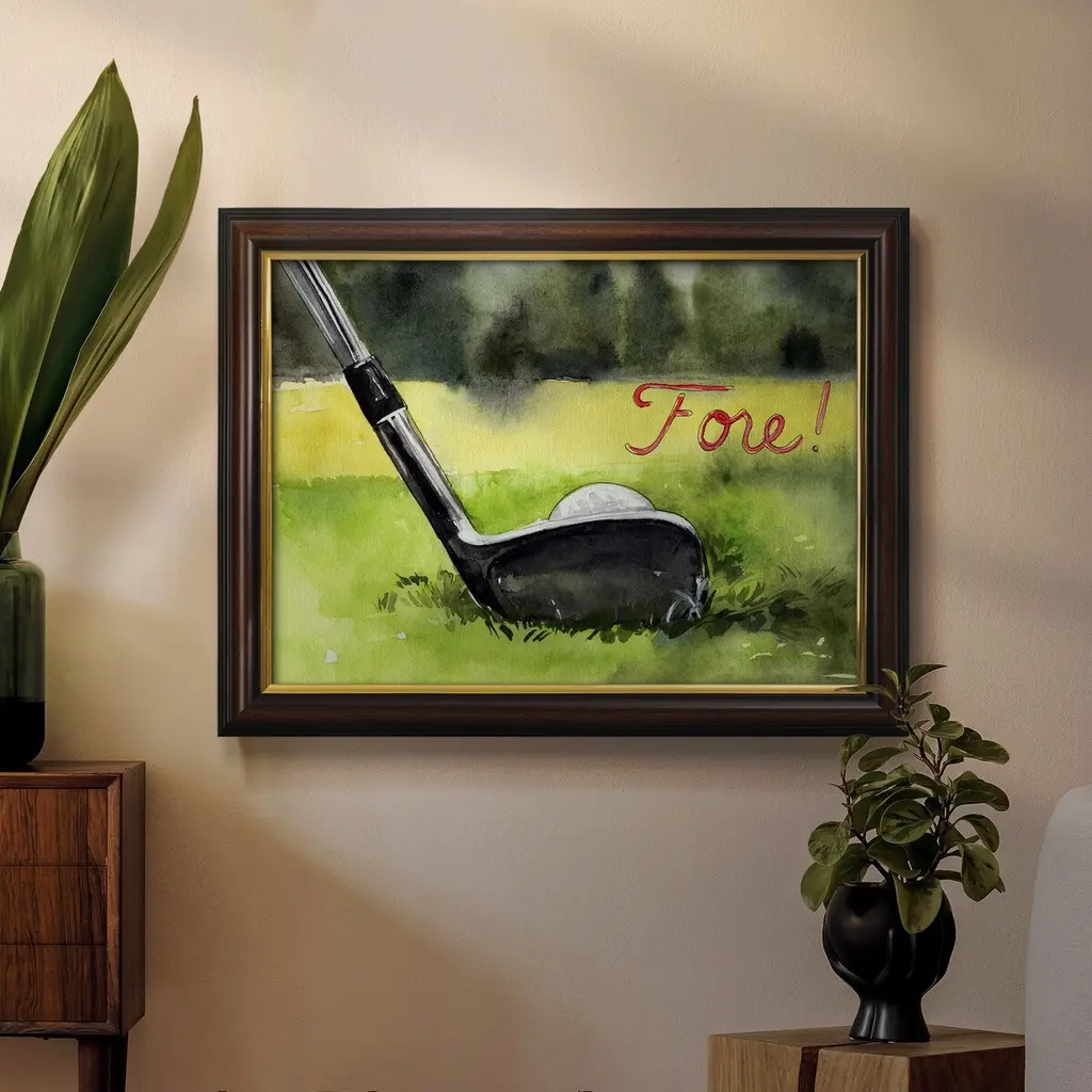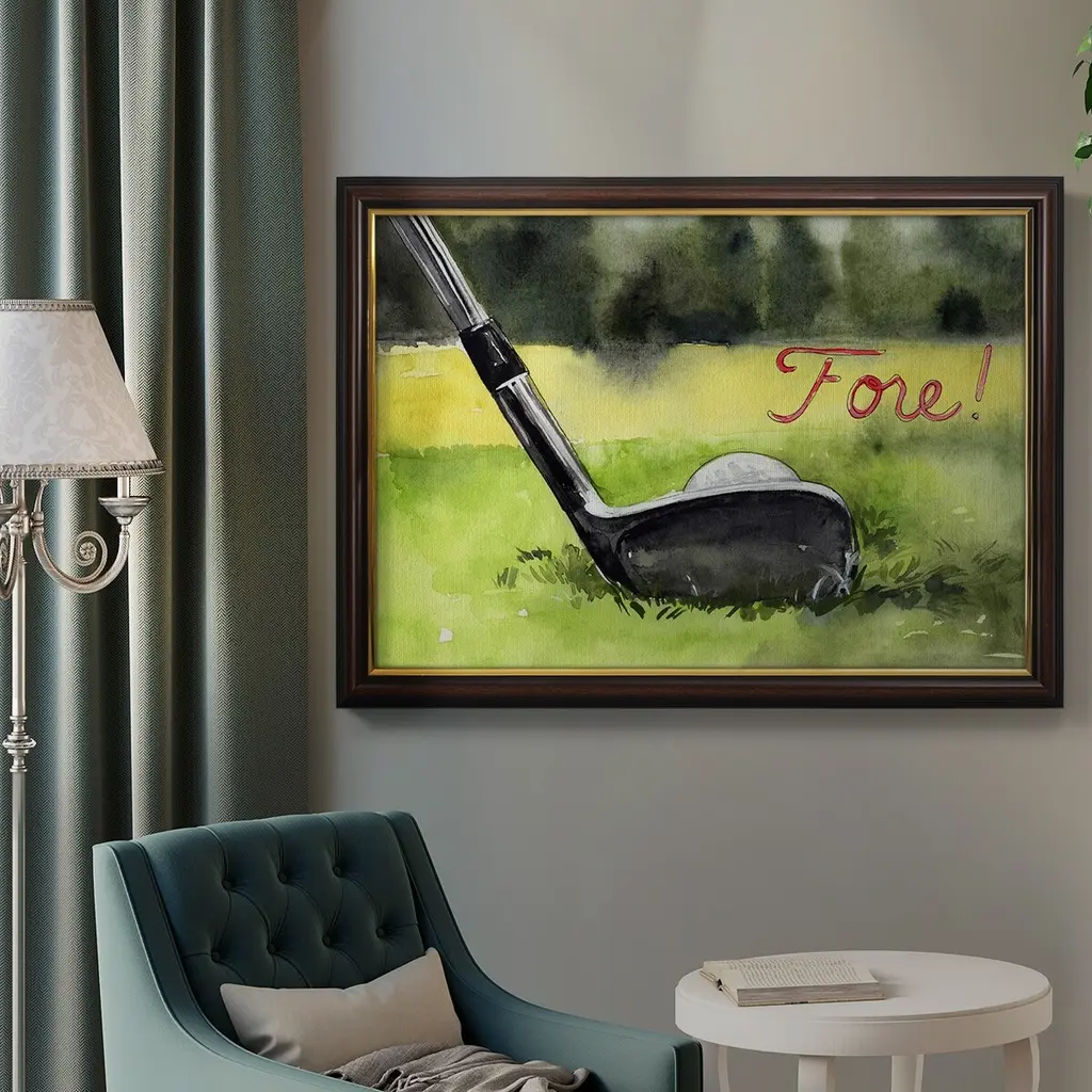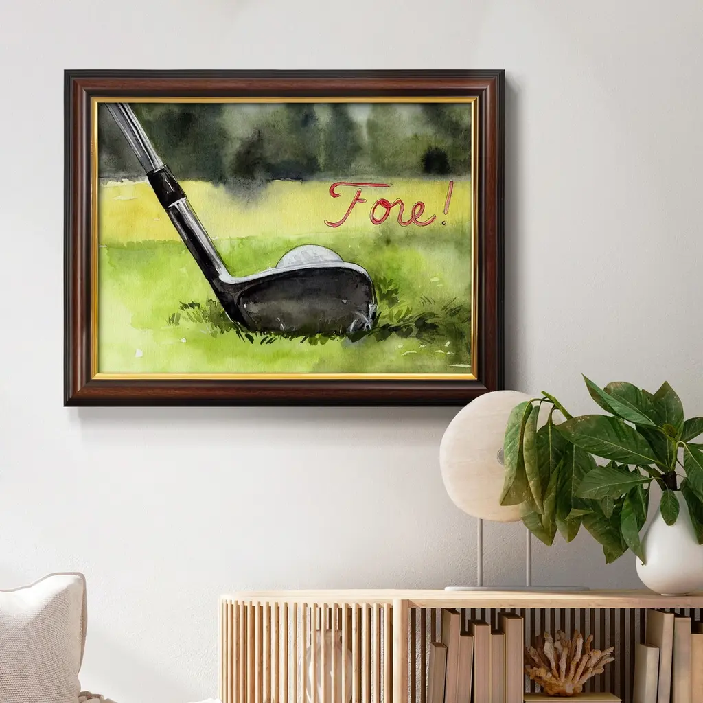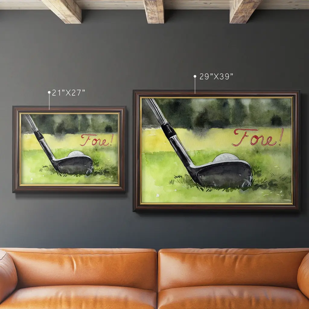 Tee Off Time IV Premium Framed Canvas- Ready to Hang A Premium Framed Canvas created to last. Framed in distressed wood and available in an array of sizes and colors Featuring a beveled a solid wood stretcher bar, each piece comes ready to hand 3 SIZES AVAILABLE 16''X20'' - Overall Size 18'X27'' - Overall Size 24''x36'' - Overall Size Each piece is made to order. Each piece comes with hanging hardware. Made in the USA Ready to Hang Giclee Paper Print Acrylic Glass Beveled Matt Board