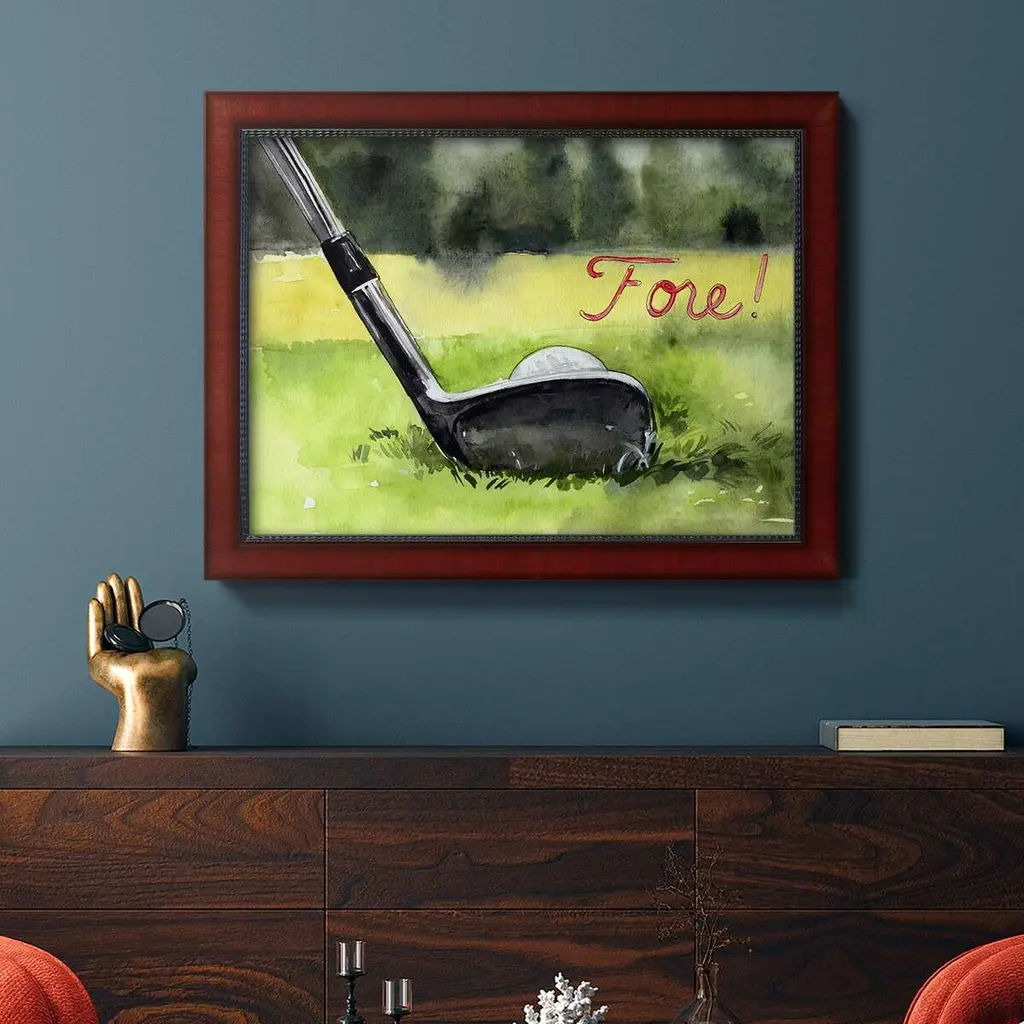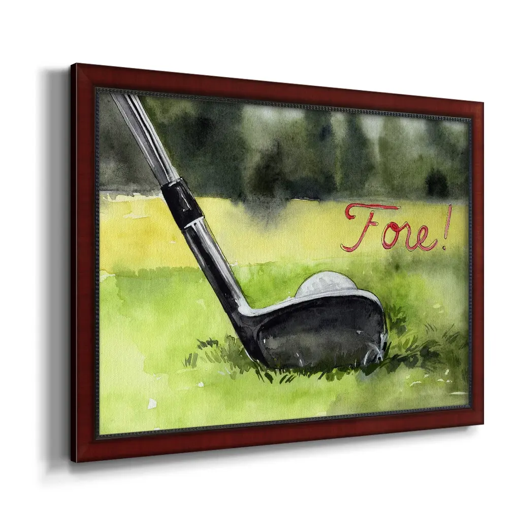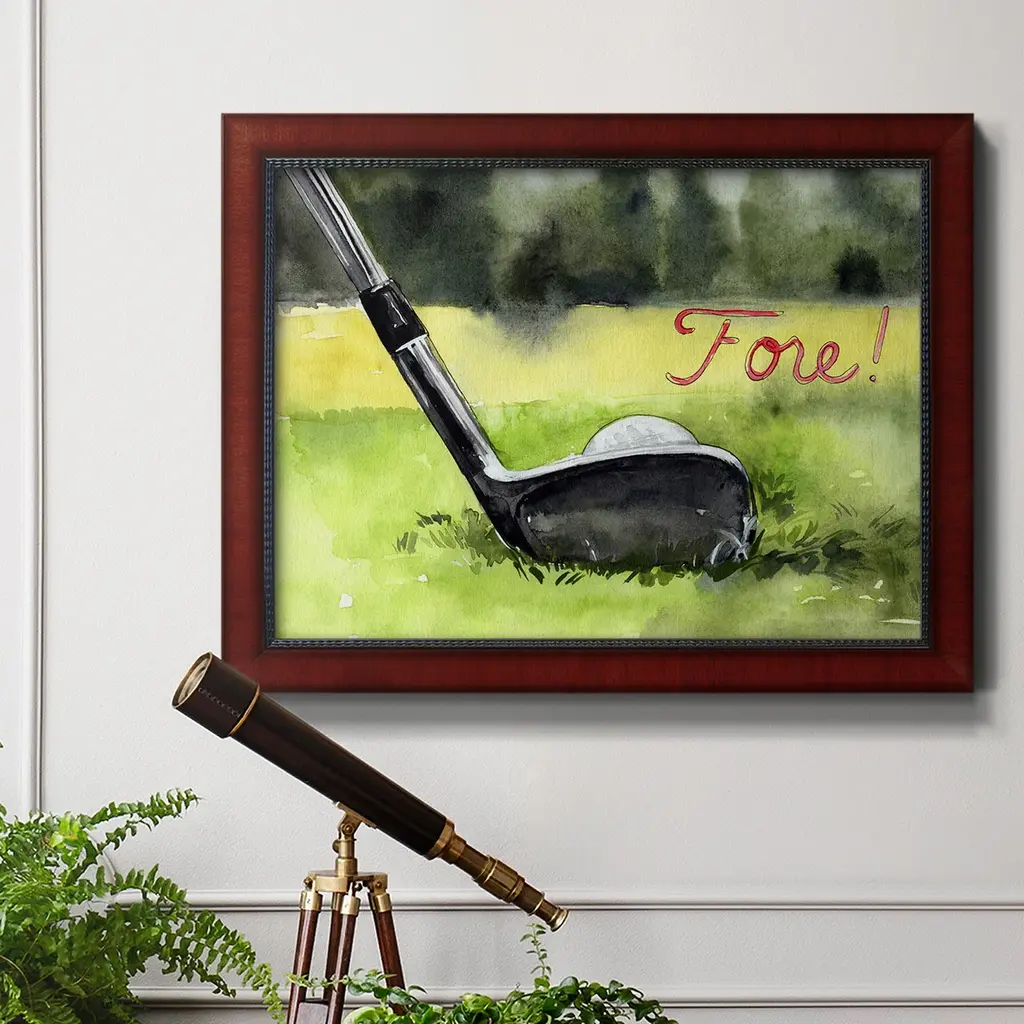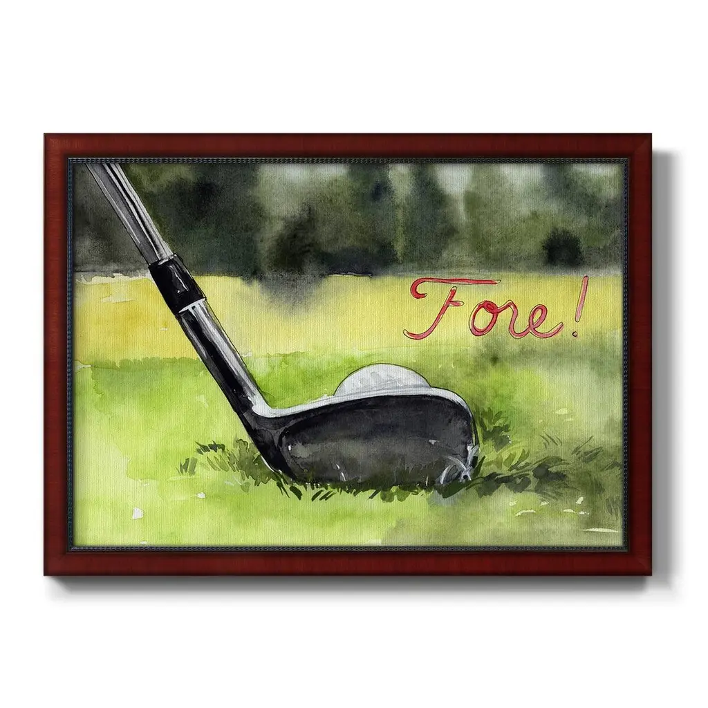 Tee Off Time IV Premium Framed Canvas- Ready to Hang A Premium Framed Canvas created to last. Framed in distressed wood and available in an array of sizes and colors Featuring a beveled a solid wood stretcher bar, each piece comes ready to hand 3 SIZES AVAILABLE 16''X20'' - Overall Size 18'X27'' - Overall Size 24''x36'' - Overall Size Each piece is made to order. Each piece comes with hanging hardware. Made in the USA Ready to Hang Giclee Paper Print Acrylic Glass Beveled Matt Board