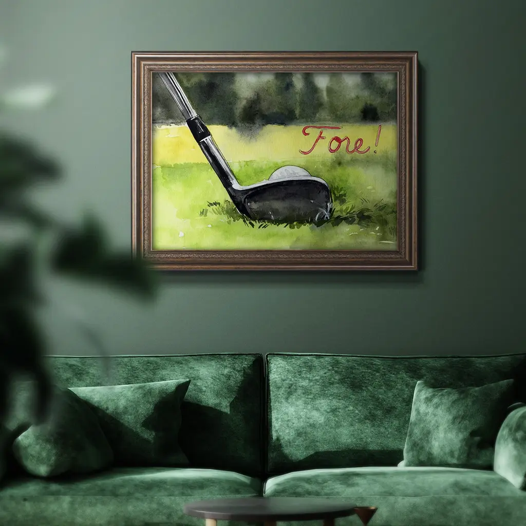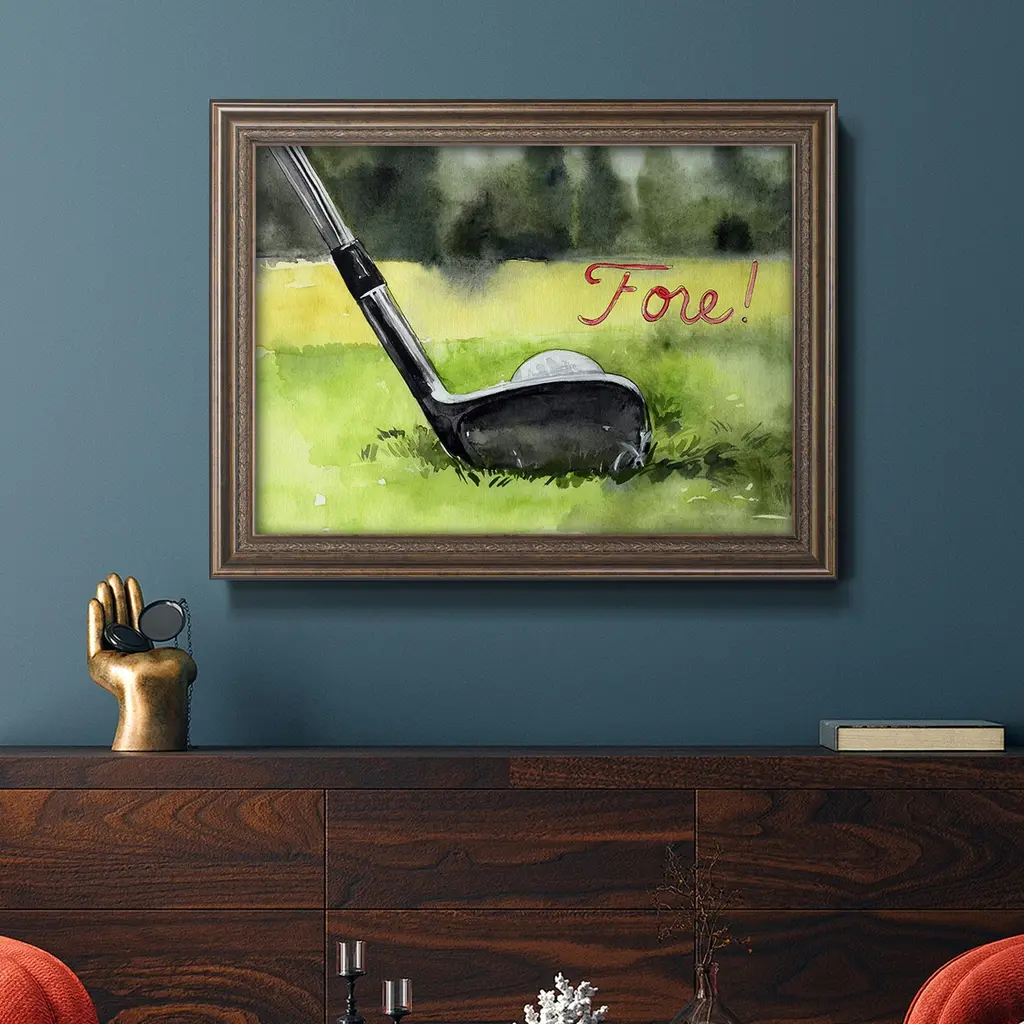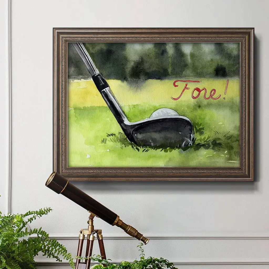 Tee Off Time IV Premium Framed Canvas- Ready to Hang A Premium Framed Canvas created to last. Framed in distressed wood and available in an array of sizes and colors Featuring a beveled a solid wood stretcher bar, each piece comes ready to hand 3 SIZES AVAILABLE 16''X20'' - Overall Size 18'X27'' - Overall Size 24''x36'' - Overall Size Each piece is made to order. Each piece comes with hanging hardware. Made in the USA Ready to Hang Giclee Paper Print Acrylic Glass Beveled Matt Board