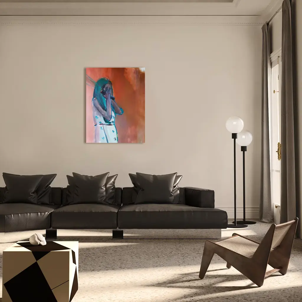 Milena Sgambato explores the inner human nature in her magnificent paintings, unique artworks to display in contemporary interior settings. Depicting a young female subject covering her face while holding a torch in one hand, the painting poignantly conveys the overwhelming feelings of fear and solitude. Please contact the Concierge for further information. This is a unique piece of art. Delivered with a certificate of authenticity. Frame not included.