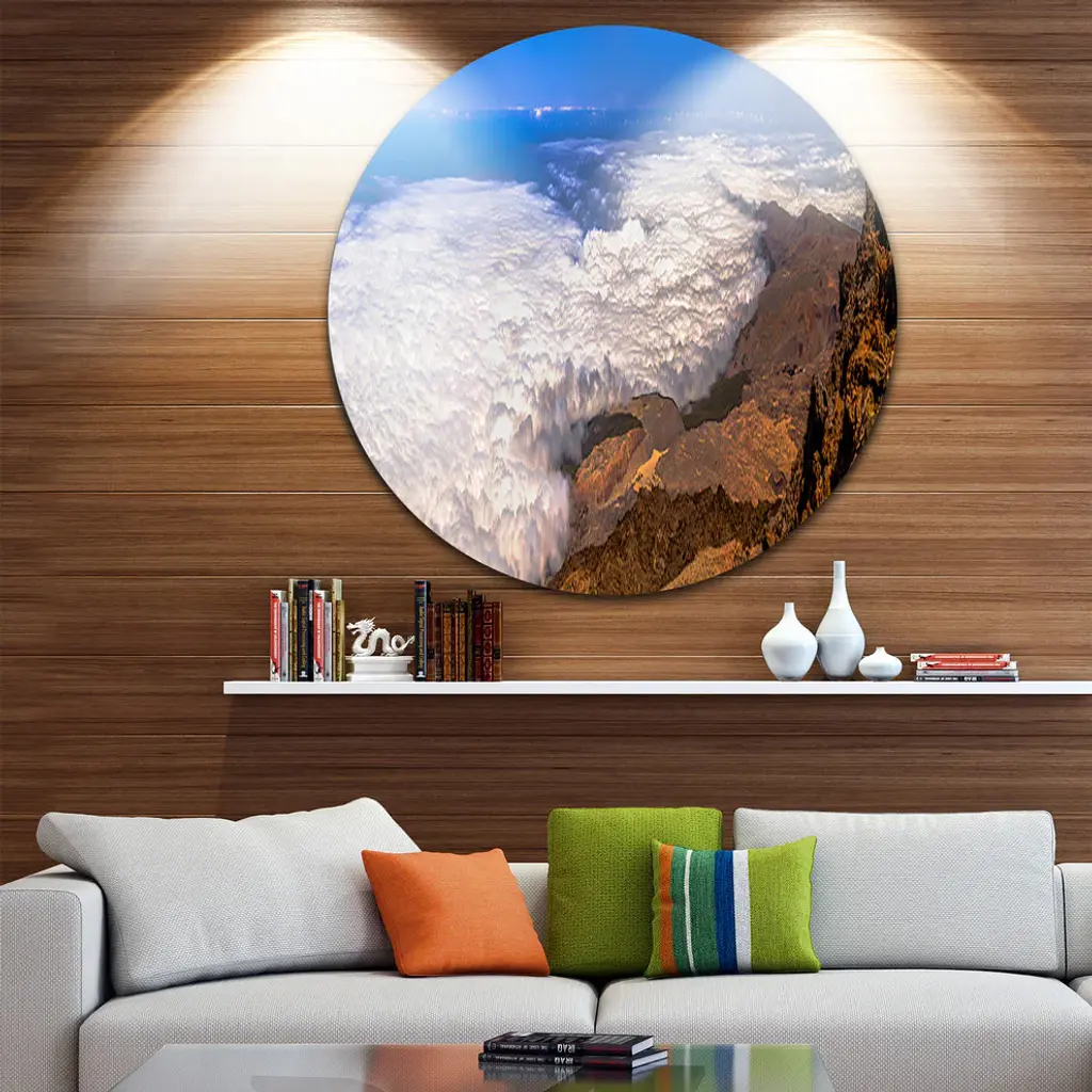Bring Contemporary Abstraction to your home with this large Circle Metal wall art. This Teide View Panoramic Metal Artwork makes it the focal point of any room or office. - White Gloss Coating ensures colors are extra vibrant with light reflection.- Aluminum grade Sheet Metal with 1 inch mounting frame on the back giving the illusion that the artwork is floating on the wall..- Mounting Brackets are included along with instructions.- High Quality Digital images are created directly into a glossy aluminum panel producing a stunning and captivating print into the glossy finish of the metal.- Water, Fire and Scratch resistant HD Aluminum panels.- Looks better than any photo paper and guaranteed to last at least 20 years- Easy to clean with a microfiber cloth. Colors are far superior to regular Canvas Art. - Easy to Hang