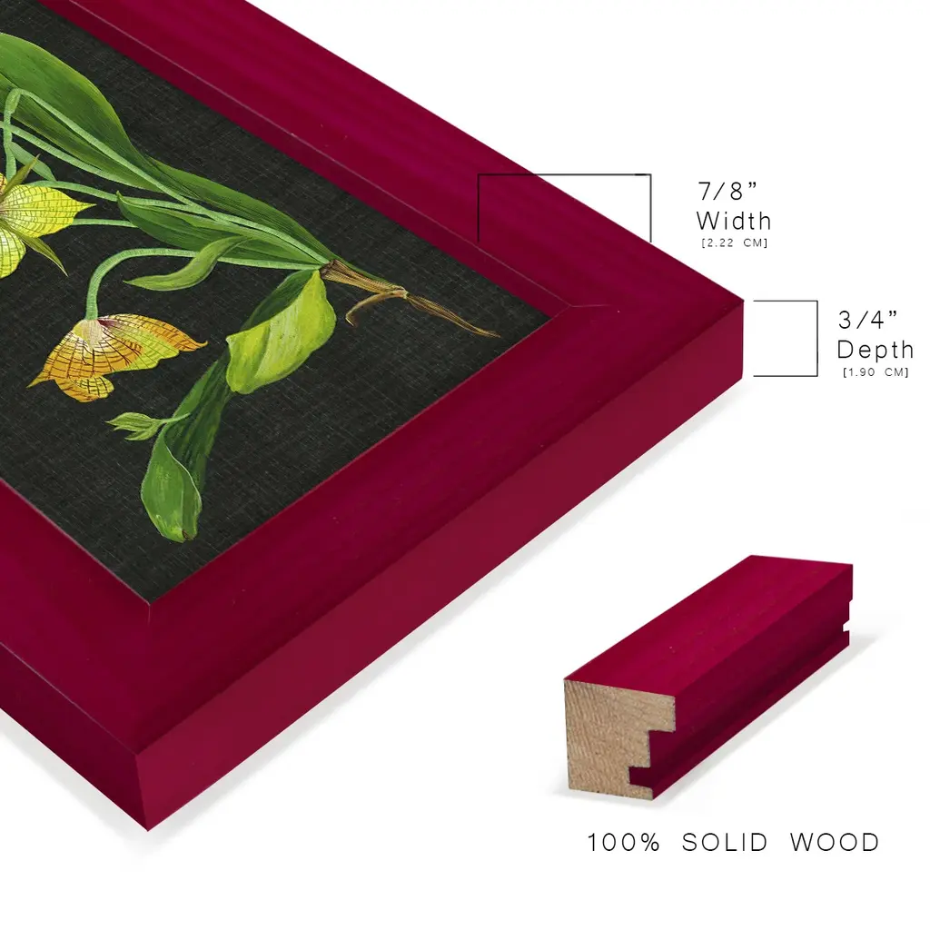 Telipogon Caulescens I -EZ SWITCH Framed Print w/glass-Cherry Red A delightful, framed print. Featuring a solid wood frame with real wood glass. This premium print is giclee quality. In addition, every frame features a removable back and table top stand. This allows you to change your art in the future or to just stand the art on a table for a new look. We are sure you'll enjoy our new series of EZ SWITCH Framed Art. Solid Wood Frame Real Glass Removable / Replaceable Art Built in Tabletop Stand Sizes range from 4x6 up to 12x15 - buy just one or pair them up as sets as you see fit.