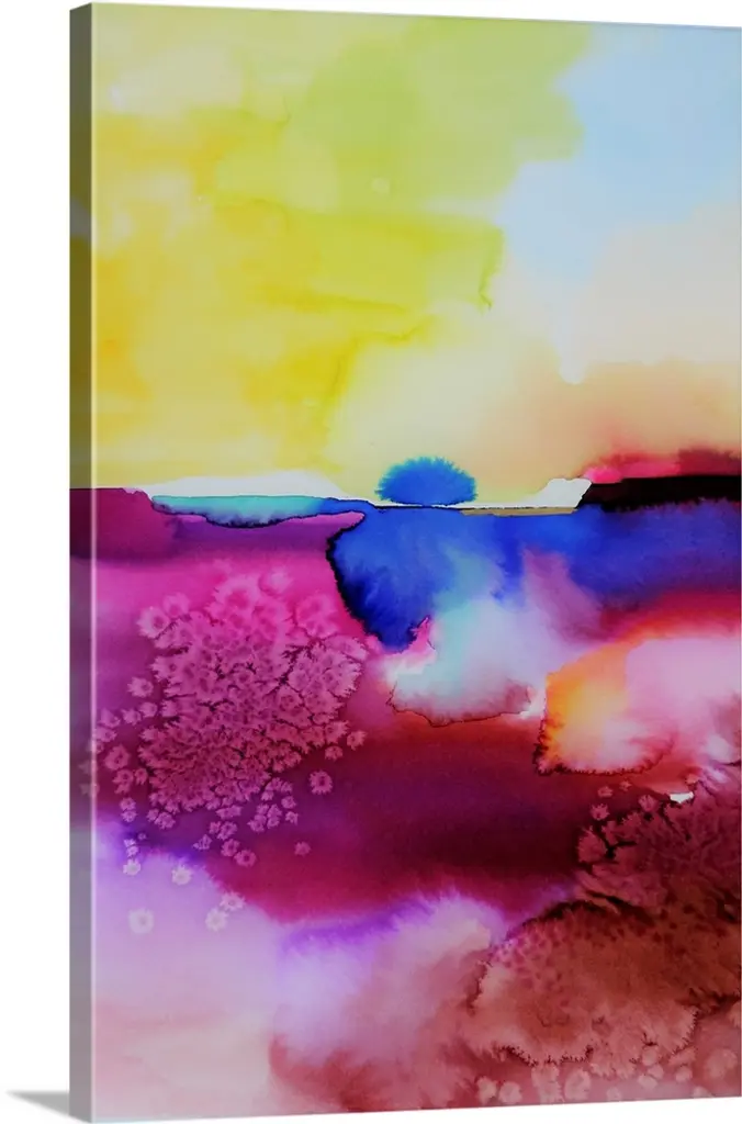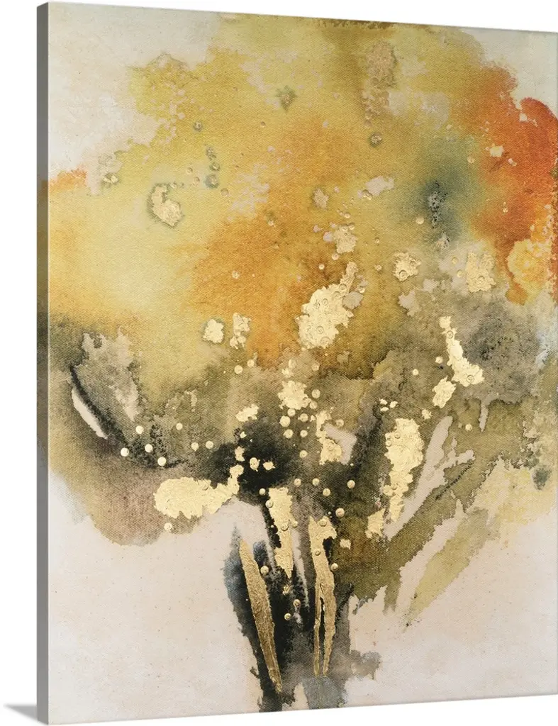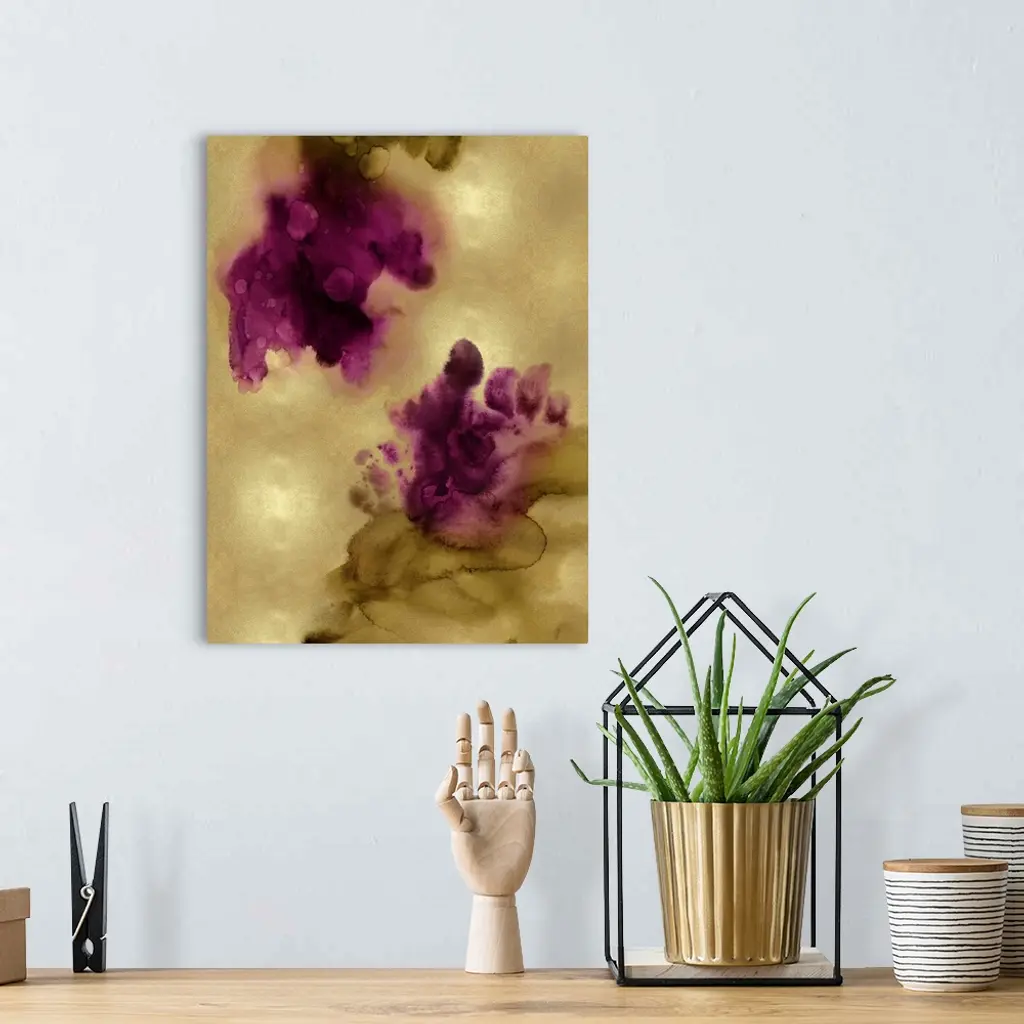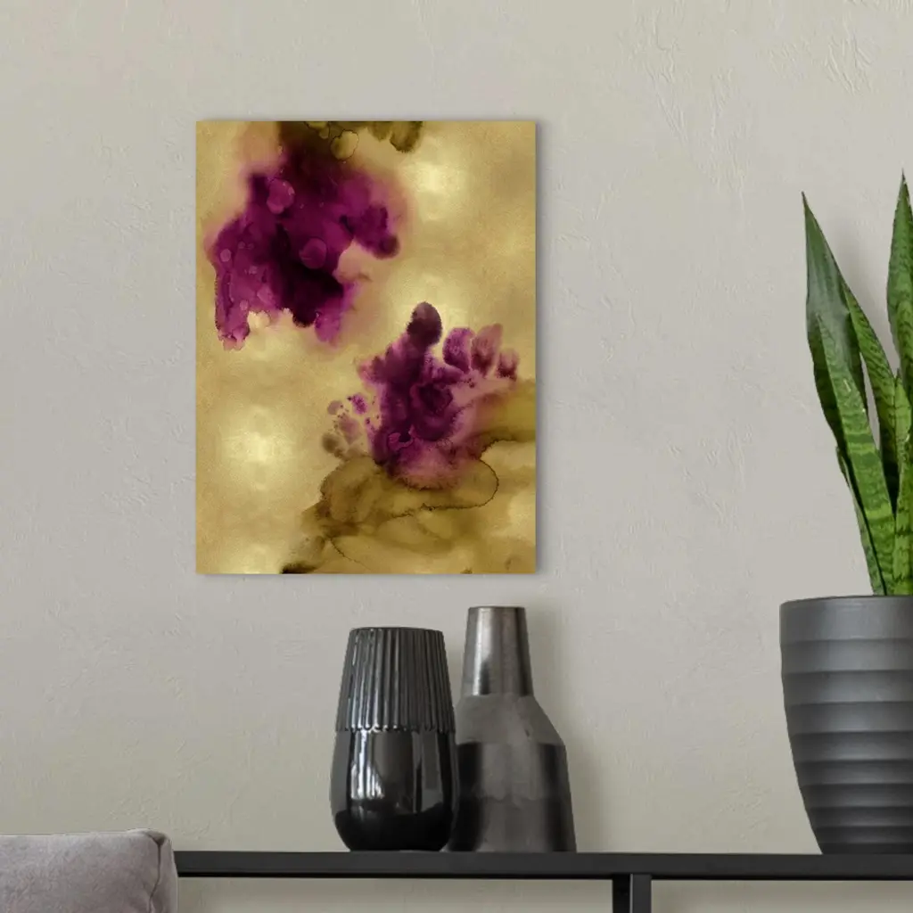 Abstract painting with fuchsia hues splattered together on a gold background.