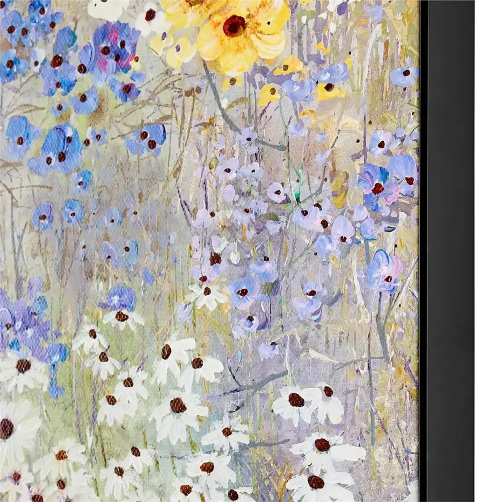 Moonlit Meadow by artist Teng Fei is a tranquil oil painting on canvas that showcases a vast, moon-kissed field of multicolored flowers. The painting features a surreal, dreamlike quality that instills a subtle sense of mystique to an interior space. This serene work of art is held within a black pinewood gallery frame and may only be displayed from a vertical orientation.
