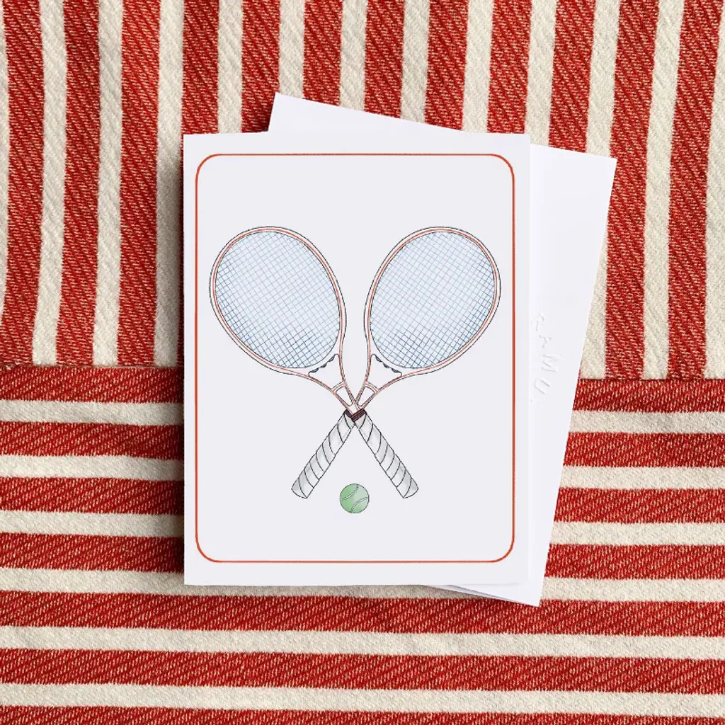 This 8-pack of greeting cards is elegantly illustrated by artist Ingrid Ramus, founder and owner of the Ramus & Co brand. Artwork features crossed tennis rackets. All greeting cards are made in the USA on heavyweight uncoated and locally-sourced and manufactured card stock. Each card is accompanied by a hand-embossed envelope made with heavyweight 95lb paper and a peel-and-stick flap - no licking envelopes here! All Ramus & Co. greeting cards are printed on FSC and SFI certified paper sourced from a regional mill that harnesses 66% of its energy from on-site sustainable sources, such as emission-free hydroelectricity and biomass co-generation from wood waste. All 8 greeting cards come packaged as a boxed set. Husband-and-wife team Calvin and Ingrid Ramus founded Ramus & Company in 2019, in New England, USA. Ingrid, the creative designer behind the brand, originates from Mexico, where she cultivated her skills in fashion and textile design. Drawing from her unique and inquisitive perspective on preppy style, Ingrid prolifically designs whimsical yet classic stationery and lifestyle items.