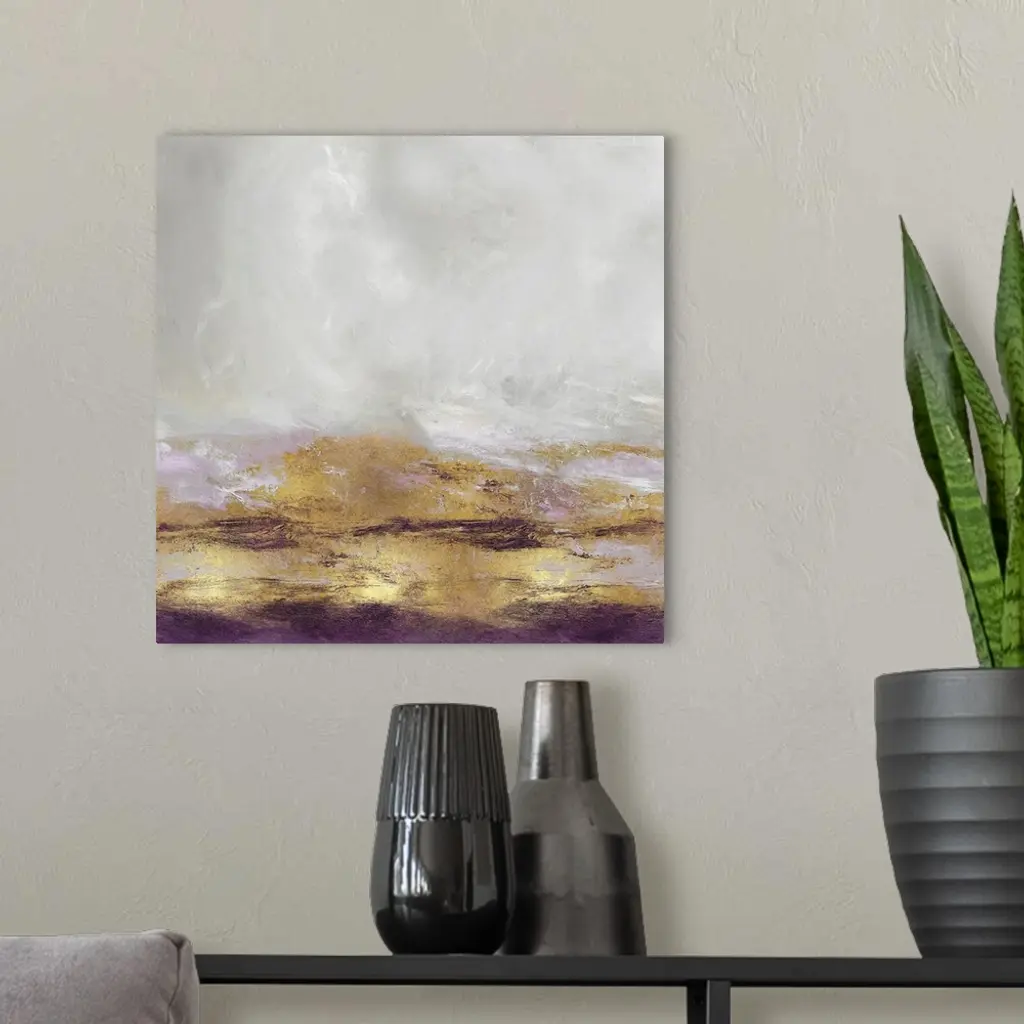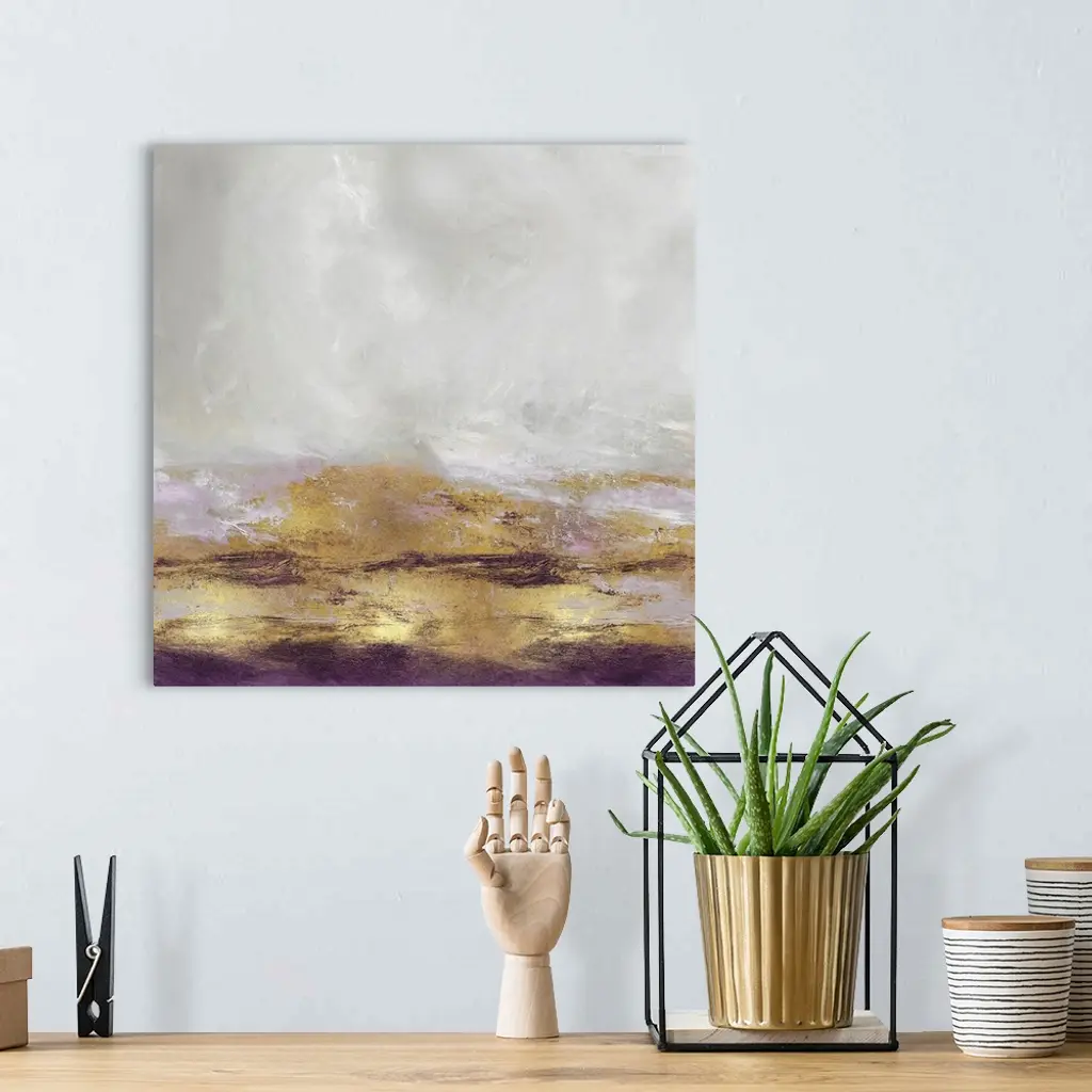 Square abstract artwork with metallic gold, silver, and amethyst purple.