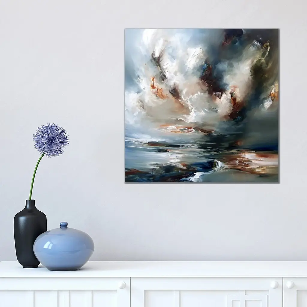 "Terra Migrante" captures a dramatic interplay of light and shadow, where swirling textures and rich tones evoke a rugged landscape. The luminous peak emerges from a dark background, conveying powerful movement and transformation. Subtle brushwork hints at the relentless forces of nature, adding an ethereal quality. This masterpiece showcases Angelo Bellobono’s exceptional ability to bring the migrating essence of the earth to life through his expert blend of oil and acrylic paints.