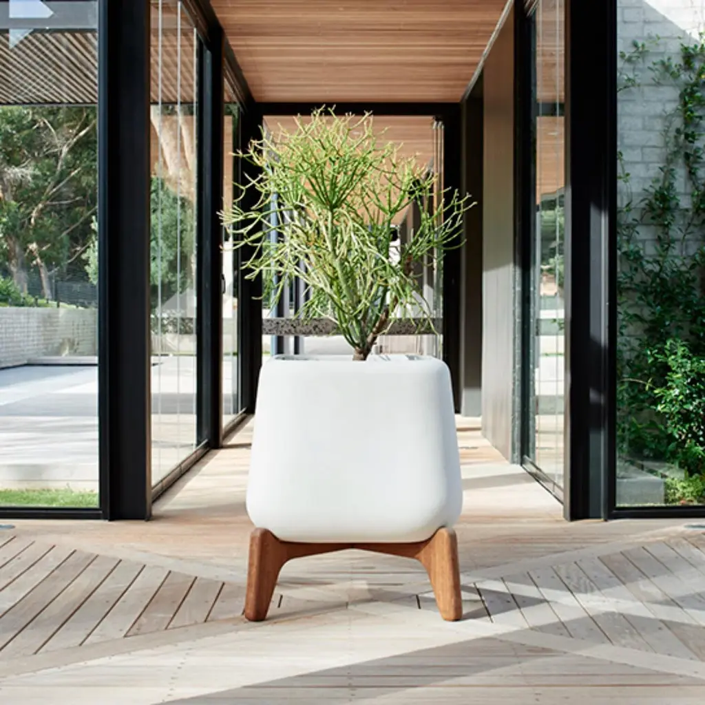 Terra Square Terracotta Planter With Natural Wood Base by IndigenusDesigned by Laurie Wiid van HeerdenDimensions: W 60,2 x H 70 cm.Materials: Stone and wood.Weight: 70 kg.Different colors and sizes are available. Wood is available with a natural or oiled finish. Please contact us.Latin for “earth” the Terra brings weight and grounding to planters raised on stands in the mid-century modern tradition. It is also square adding to the solidity and the wooden bases are contoured and sculpted into the planter making for a stable earthy interpretation that still feels light, modern, and elegantly curvaceous.Indigenus, founded in 2014, is the brainchild of Cape Town local, Peter van der Post. At the beginning of his career, whilst working in roto-moulding, Peter noticed a lack of high design planters in the market and the vision to produce the most beautiful, original, and desirable planters began to grow. Over the past 8 years, the Indigenus team has collaborated with South Africa’s top designers to create planters that are art pieces in their own right. 2022 has seen exciting collaborations further afield with internationally renowned designers and collaborators. In line with our sustainability and quality luxury objectives, we are constantly striving to make planters for life and not just for a few seasons. It has taken years of refinement, many valuable lessons learned and, ultimately, setting up our world-class factory for in-house manufacturing to be able to ensure that the planters are of the highest quality. All materials are sustainably sourced and the planters are made by hand. It is this craftsmanship that puts Indigenus in a league of its own. Each range of planters is unique and illustrates the impact that beautiful sculptural planters have on architecture and landscapes. The planters' close connection to the earth is expressed through a stable and grounded design, made with beautiful natural materials and evoking an underlying story of our relationship with the natural world.Indigenus is focused on collaboration with the world’s top designers and artists. We are committed to constant refinement and a willingness to be courageous, curious, and experimental with natural materials and new designs. We have built solid distributor networks and relationships that we are committed to maintaining and growing globally. We are proud of our roots as an African luxury brand with a global footprint.