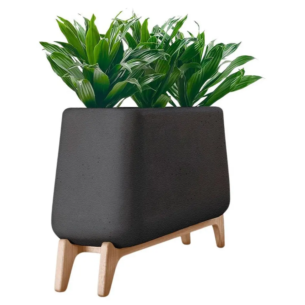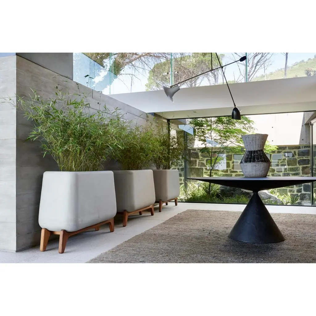 Terra Through White Planter With Natural Wood Base by IndigenusDesigned by Laurie Wiid van HeerdenDimensions: W 122,2 x H 85 cm.Materials: Stone and wood.Weight: 95 kg.Different colors and sizes are available. Wood is available with a natural or oiled finish. Please contact us.Latin for “earth” the Terra brings weight and grounding to planters raised on stands in the mid-century modern tradition. It is also square adding to the solidity and the wooden bases are contoured and sculpted into the planter making for a stable earthy interpretation that still feels light, modern and elegantly curvaceous.Indigenus, founded in 2014, is the brainchild of Cape Town local, Peter van der Post. At the beginning of his career, whilst working in roto-moulding, Peter noticed a lack of high design planters in the market and the vision to produce the most beautiful, original, and desirable planters began to grow. Over the past 8 years, the Indigenus team has collaborated with South Africa’s top designers to create planters that are art pieces in their own right. 2022 has seen exciting collaborations further afield with internationally renowned designers and collaborators. In line with our sustainability and quality luxury objectives, we are constantly striving to make planters for life and not just for a few seasons. It has taken years of refinement, many valuable lessons learned and, ultimately, setting up our world-class factory for in-house manufacturing to be able to ensure that the planters are of the highest quality. All materials are sustainably sourced and the planters are made by hand. It is this craftsmanship that puts Indigenus in a league of its own. Each range of planters is unique and illustrates the impact that beautiful sculptural planters have on architecture and landscapes. The planters' close connection to the earth is expressed through a stable and grounded design, made with beautiful natural materials and evoking an underlying story of our relationship with the natural world.Indigenus is focused on collaboration with the world’s top designers and artists. We are committed to constant refinement and a willingness to be courageous, curious, and experimental with natural materials and new designs. We have built solid distributor networks and relationships that we are committed to maintaining and growing globally. We are proud of our roots as an African luxury brand with a global footprint.