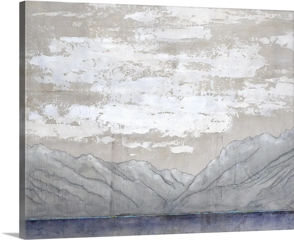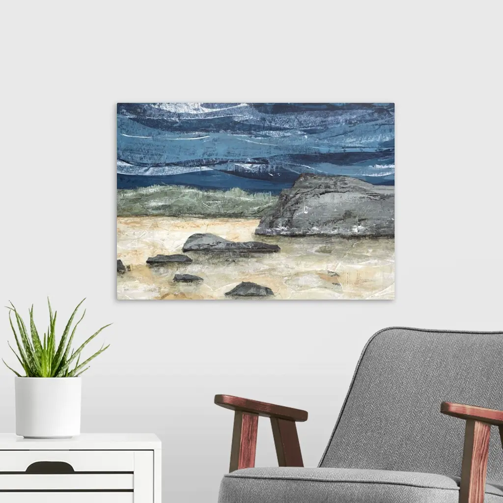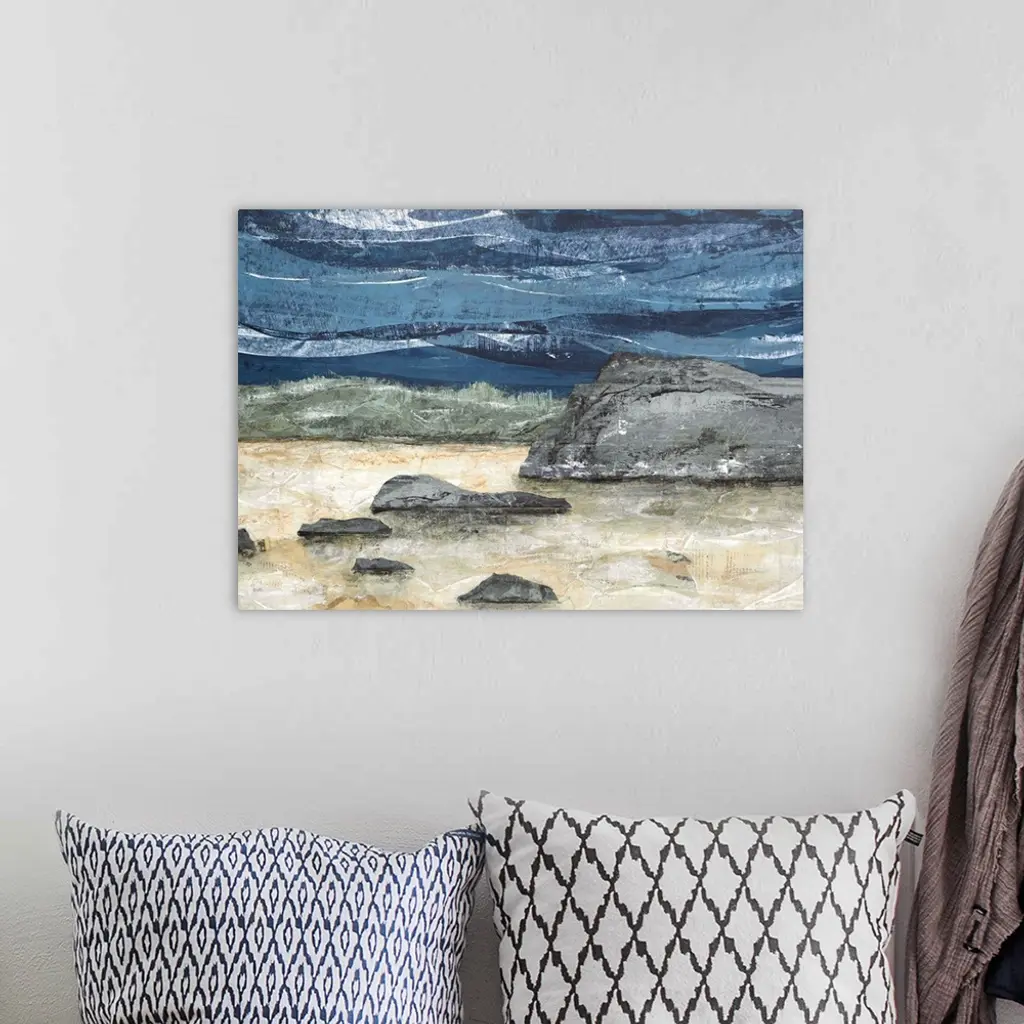 Abstract landscape painting with a rocky ground and a wavy blue sky.