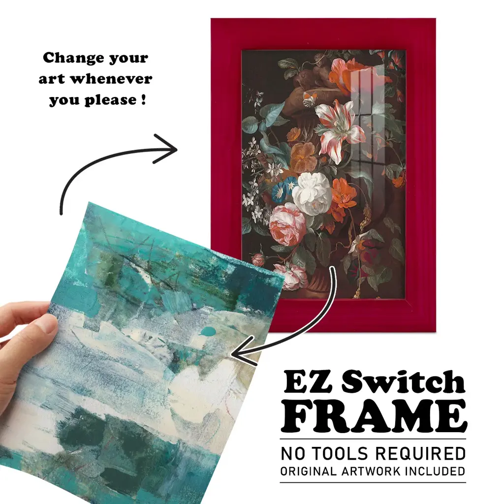 Terrene Abstract I -EZ SWITCH Framed Print w/glass-Cherry Red A delightful, framed print. Featuring a solid wood frame with real wood glass. This premium print is giclee quality. In addition, every frame features a removable back and table top stand. This allows you to change your art in the future or to just stand the art on a table for a new look. We are sure you'll enjoy our new series of EZ SWITCH Framed Art. Solid Wood Frame Real Glass Removable / Replaceable Art Built in Tabletop Stand Sizes range from 4x6 up to 12x15 - buy just one or pair them up as sets as you see fit.