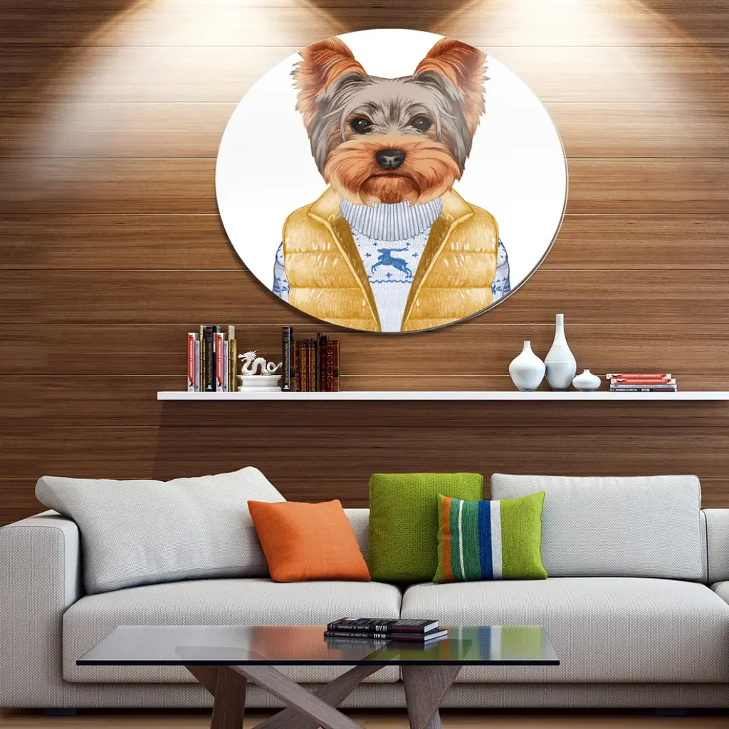 Bring Contemporary Abstraction to your home with this large Circle Metal wall art. This Terrier in Down Vest and Sweater Metal Artwork makes it the focal point of any room or office. - White Gloss Coating ensures colors are extra vibrant with light reflection.- Aluminum grade Sheet Metal with 1 inch mounting frame on the back giving the illusion that the artwork is floating on the wall..- Mounting Brackets are included along with instructions.- High Quality Digital images are created directly into a glossy aluminum panel producing a stunning and captivating print into the glossy finish of the metal.- Water, Fire and Scratch resistant HD Aluminum panels.- Looks better than any photo paper and guaranteed to last at least 20 years- Easy to clean with a microfiber cloth. Colors are far superior to regular Canvas Art. - Easy to Hang