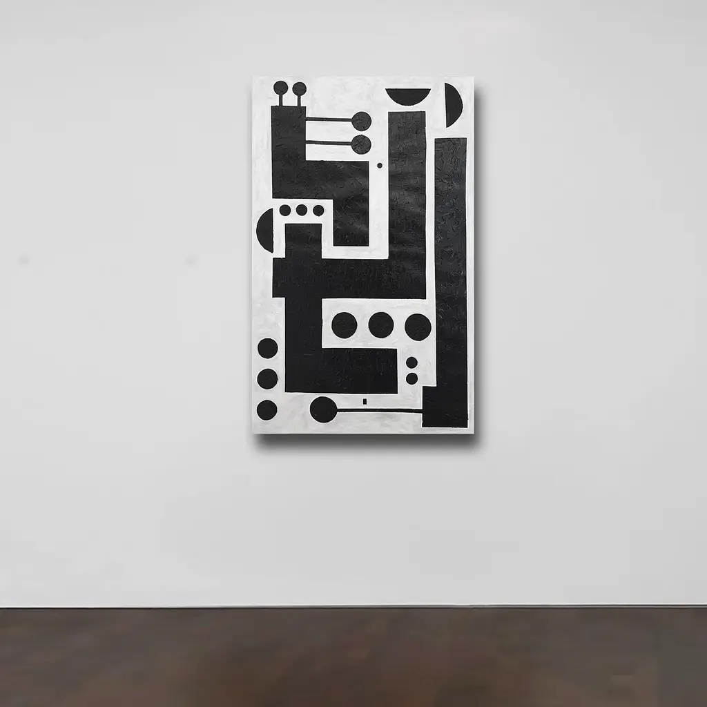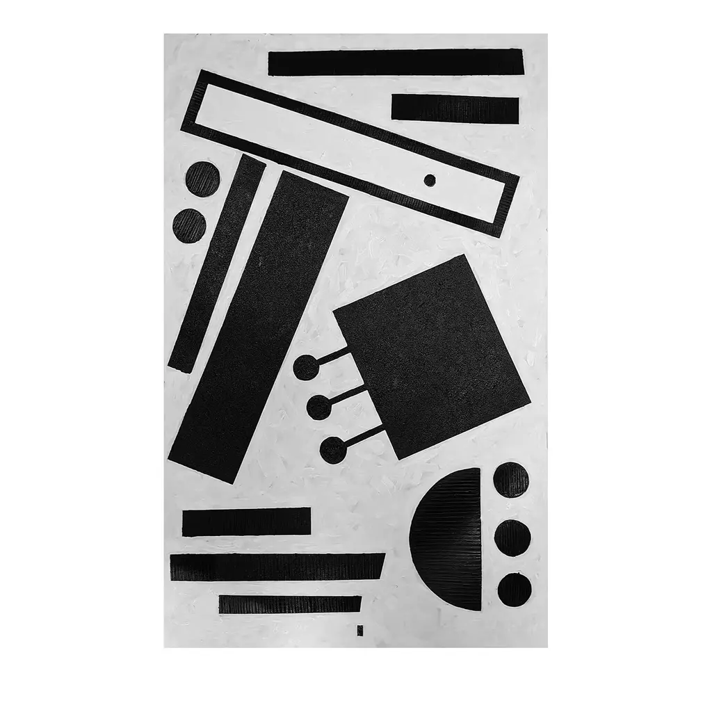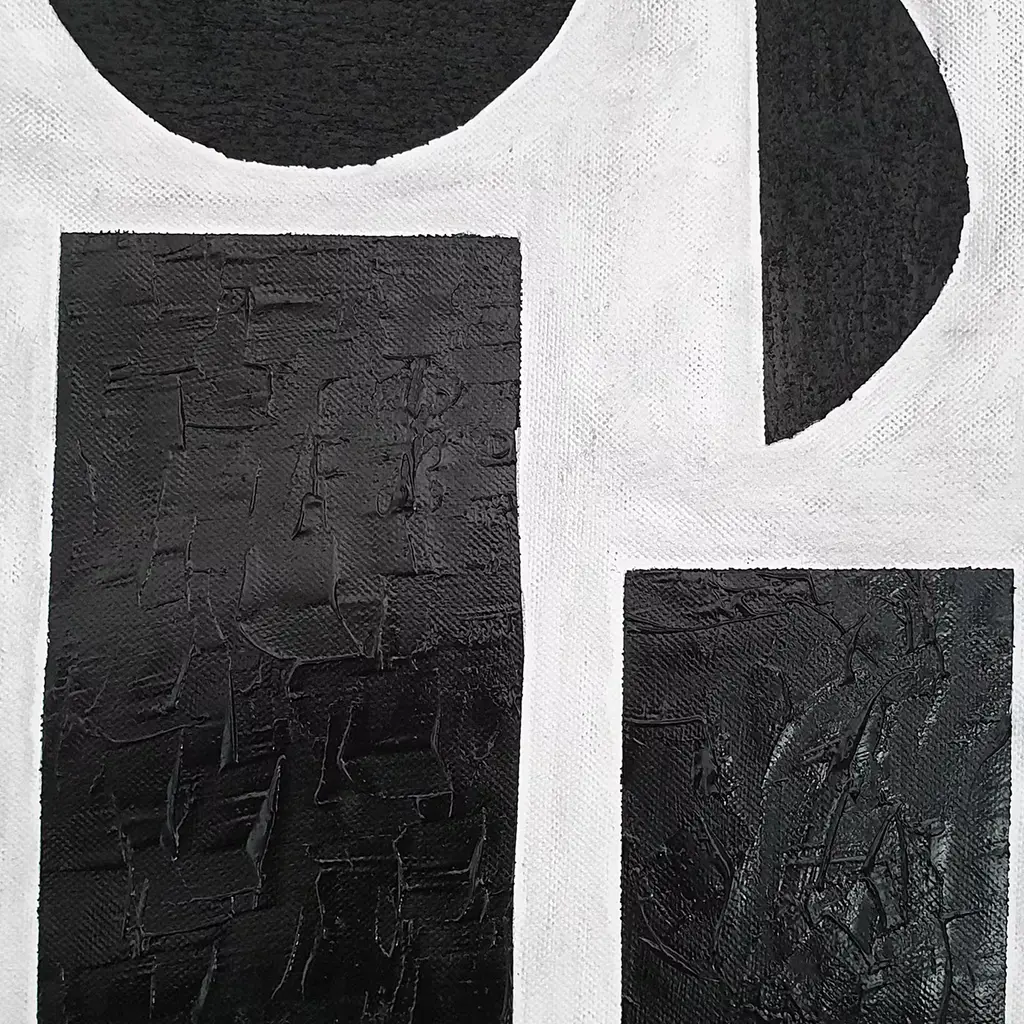 The Testa No.XXV is an abstract painting that delves into the intricate relationship between form and space. This unique piece serves as a profound exploration of equilibrium and tension, where geometric shapes transcend mere visual elements, embodying a language of abstraction that invites personal interpretation. The striking contrast of black and white enhances the dynamism of the composition, transforming the canvas into a visual field where order and chaos coexist harmoniously. Each viewing offers a moment of reflection, encouraging deeper contemplation and engagement with the myriad meanings this artwork can convey. The canvas is unframed.