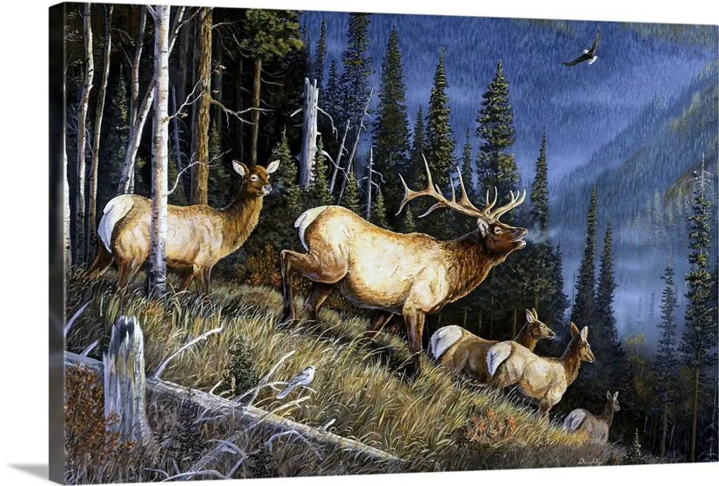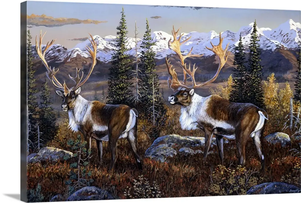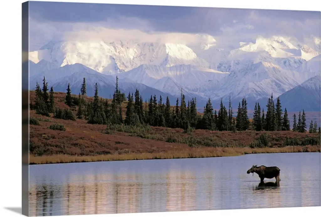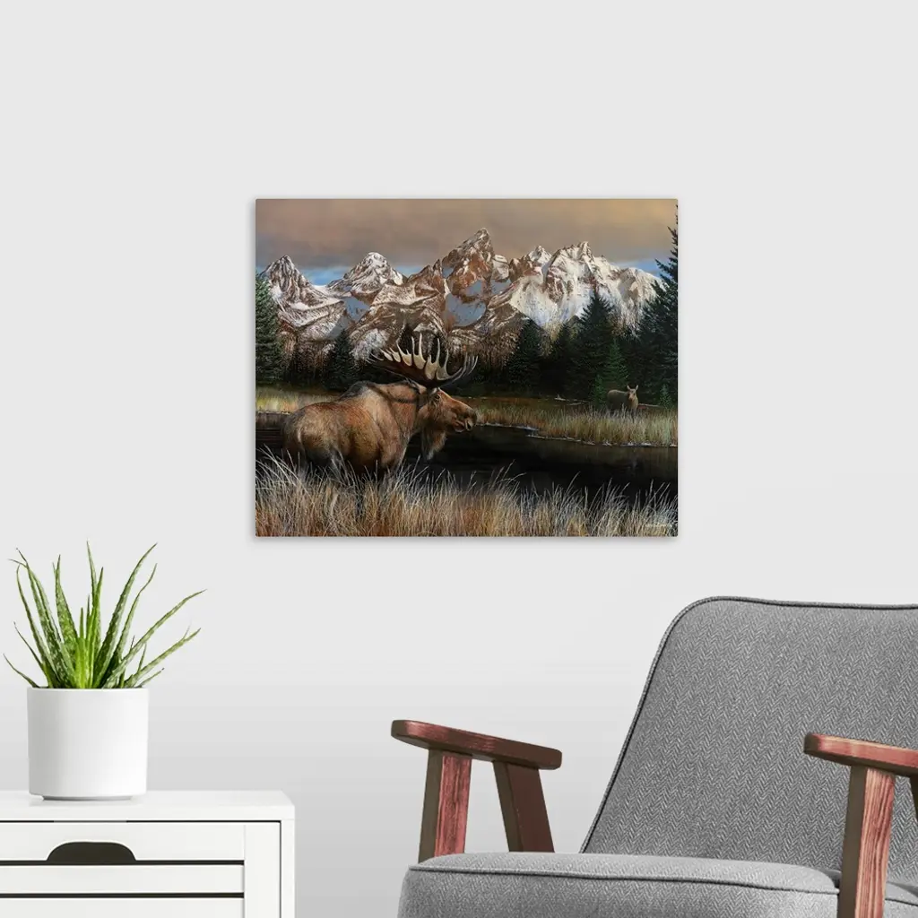 Painting of a moose standing in tall grass next to a river with a rugged mountain range in the background.