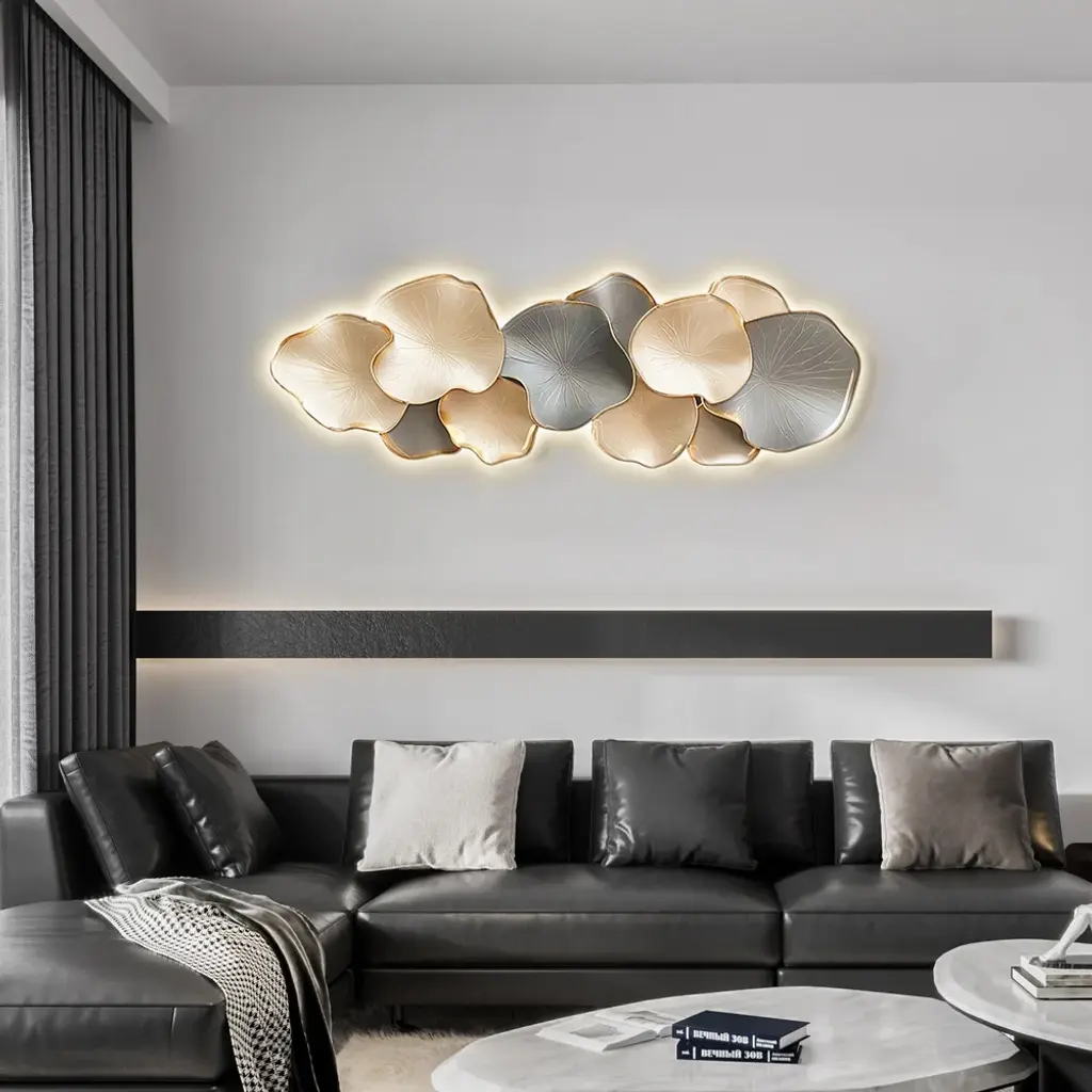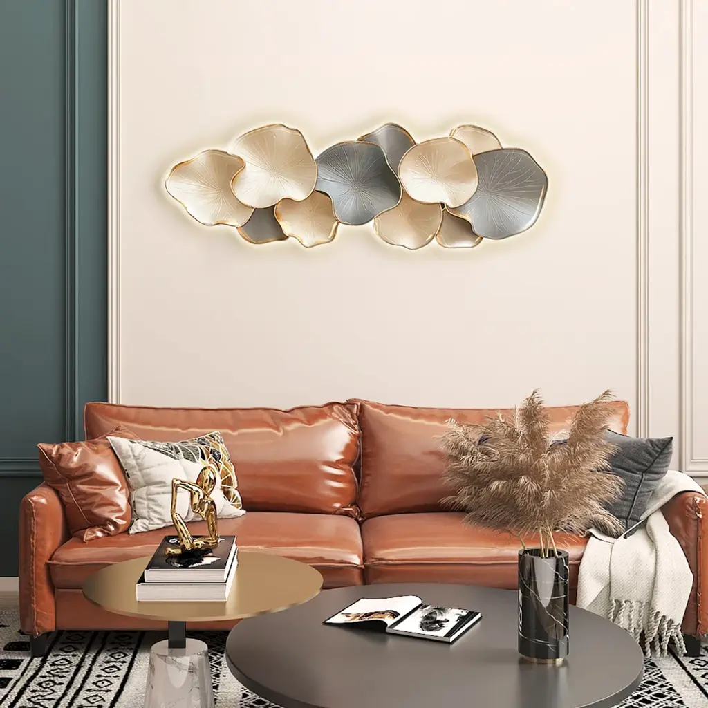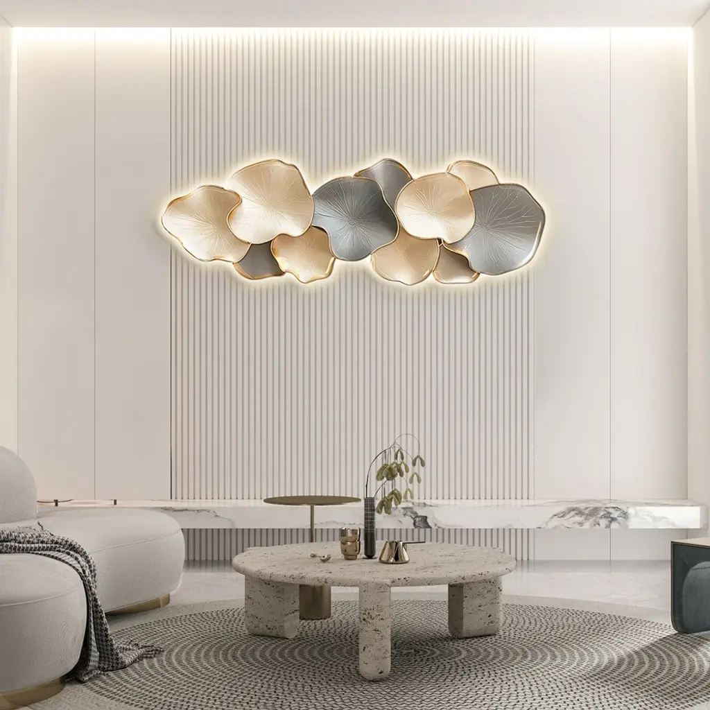 This stunning wall decor features an intricate arrangement of abstract shapes illuminated by built-in LED lights, creating a mesmerizing ambiance. Its soft hues and metallic tones add a luxurious, contemporary feel to any living room or hallway, perfect for adding sophistication to your space.