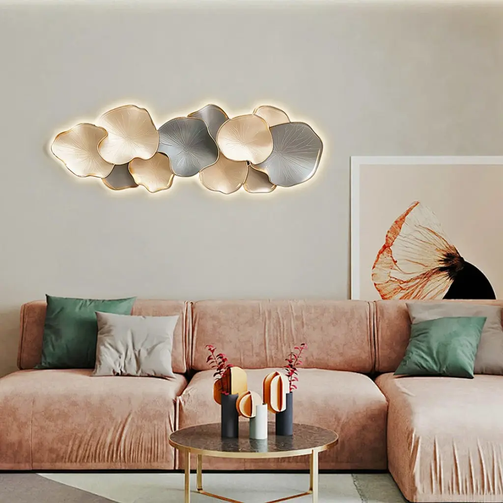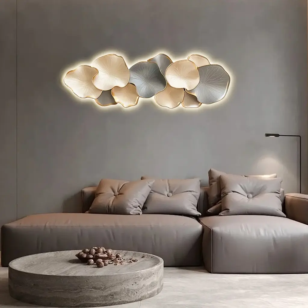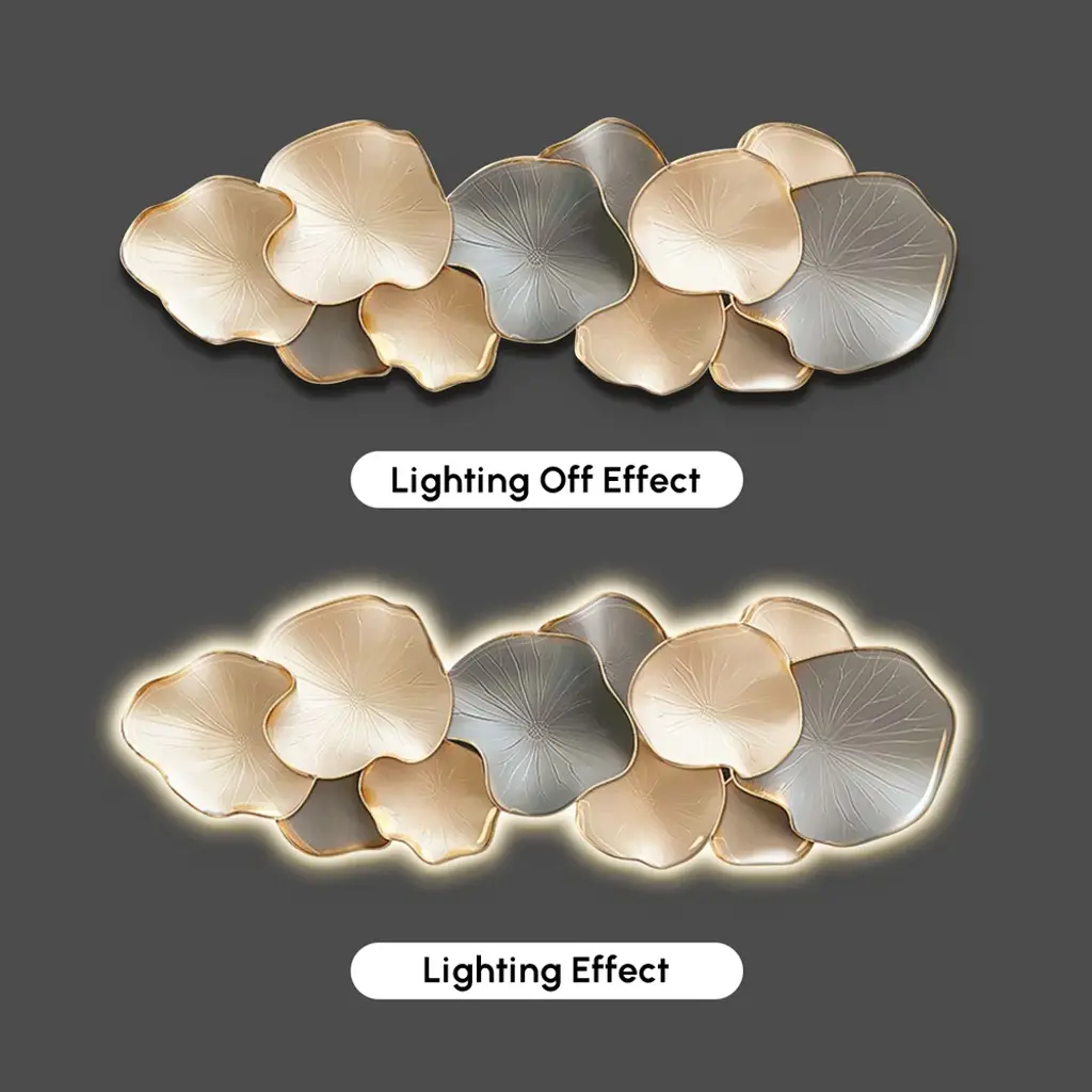 This stunning wall decor features an intricate arrangement of abstract shapes illuminated by built-in LED lights, creating a mesmerizing ambiance. Its soft hues and metallic tones add a luxurious, contemporary feel to any living room or hallway, perfect for adding sophistication to your space.