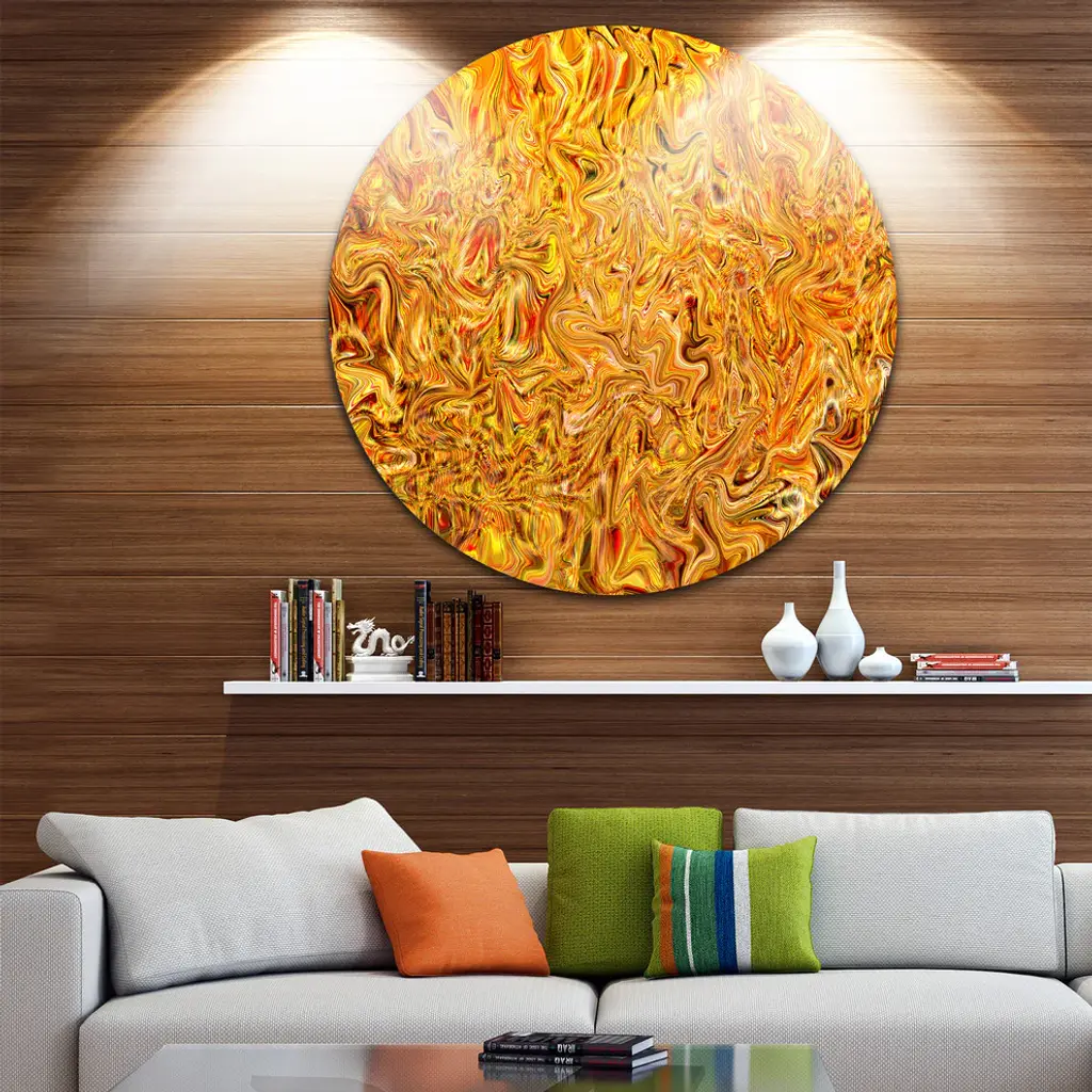 Bring Contemporary Abstraction to your home with this large Circle Metal wall art. This Textured Flowing Yellow Metal Artwork makes it the focal point of any room or office. - White Gloss Coating ensures colors are extra vibrant with light reflection.- Aluminum grade Sheet Metal with 1 inch mounting frame on the back giving the illusion that the artwork is floating on the wall..- Mounting Brackets are included along with instructions.- High Quality Digital images are created directly into a glossy aluminum panel producing a stunning and captivating print into the glossy finish of the metal.- Water, Fire and Scratch resistant HD Aluminum panels.- Looks better than any photo paper and guaranteed to last at least 20 years- Easy to clean with a microfiber cloth. Colors are far superior to regular Canvas Art. - Easy to Hang