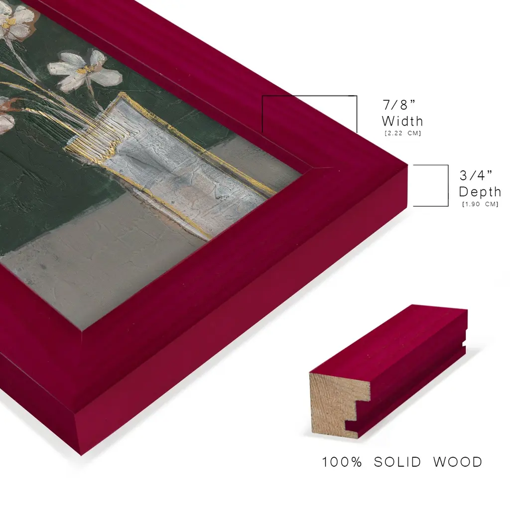 Textured Still Life II -EZ SWITCH Framed Print w/glass-Cherry Red A delightful, framed print. Featuring a solid wood frame with real wood glass. This premium print is giclee quality. In addition, every frame features a removable back and table top stand. This allows you to change your art in the future or to just stand the art on a table for a new look. We are sure you'll enjoy our new series of EZ SWITCH Framed Art. Solid Wood Frame Real Glass Removable / Replaceable Art Built in Tabletop Stand Sizes range from 4x6 up to 12x15 - buy just one or pair them up as sets as you see fit.