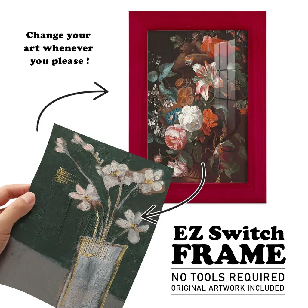 Textured Still Life II -EZ SWITCH Framed Print w/glass-Cherry Red A delightful, framed print. Featuring a solid wood frame with real wood glass. This premium print is giclee quality. In addition, every frame features a removable back and table top stand. This allows you to change your art in the future or to just stand the art on a table for a new look. We are sure you'll enjoy our new series of EZ SWITCH Framed Art. Solid Wood Frame Real Glass Removable / Replaceable Art Built in Tabletop Stand Sizes range from 4x6 up to 12x15 - buy just one or pair them up as sets as you see fit.