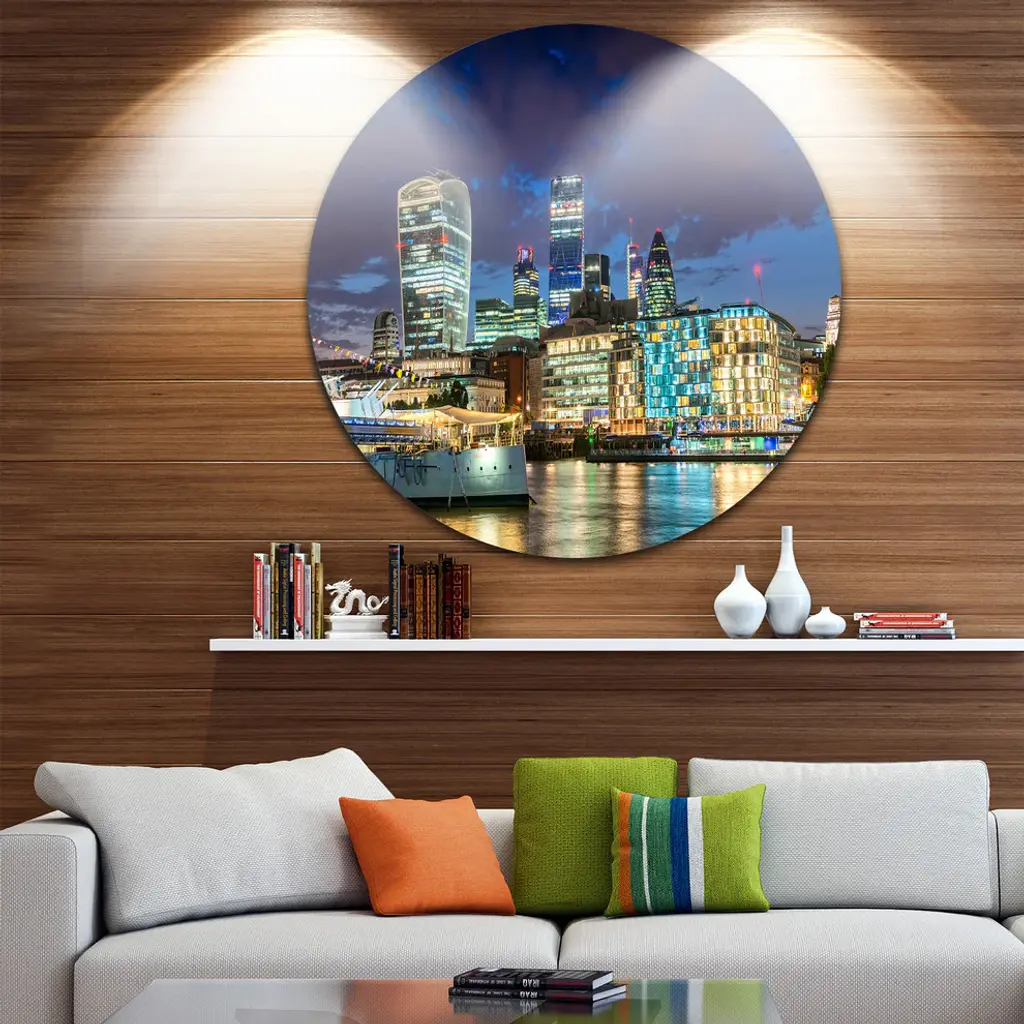 Bring Contemporary Abstraction to your home with this large Circle Metal wall art. This Thames River at Night Metal Artwork makes it the focal point of any room or office. - White Gloss Coating ensures colors are extra vibrant with light reflection.- Aluminum grade Sheet Metal with 1 inch mounting frame on the back giving the illusion that the artwork is floating on the wall..- Mounting Brackets are included along with instructions.- High Quality Digital images are created directly into a glossy aluminum panel producing a stunning and captivating print into the glossy finish of the metal.- Water, Fire and Scratch resistant HD Aluminum panels.- Looks better than any photo paper and guaranteed to last at least 20 years- Easy to clean with a microfiber cloth. Colors are far superior to regular Canvas Art. - Easy to Hang