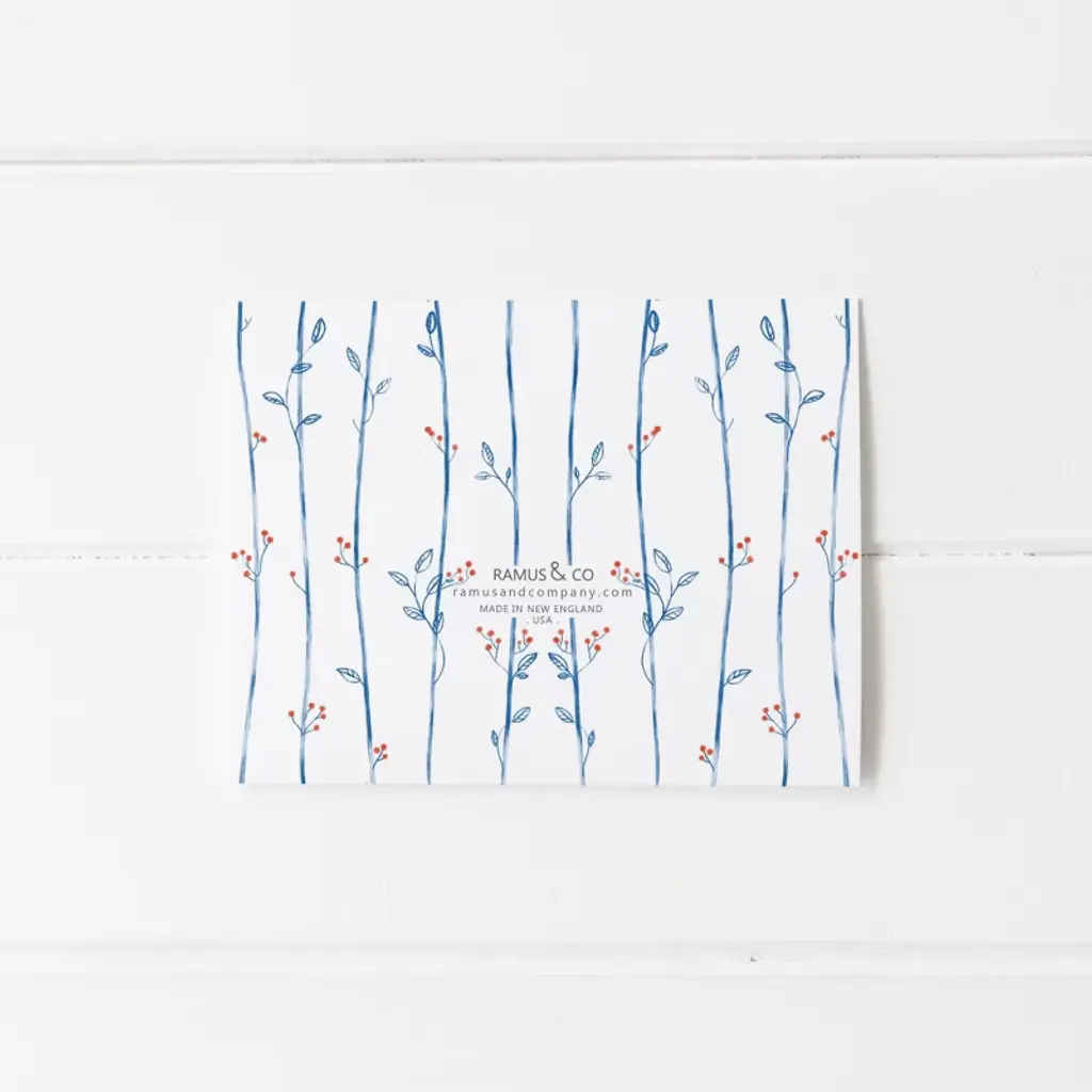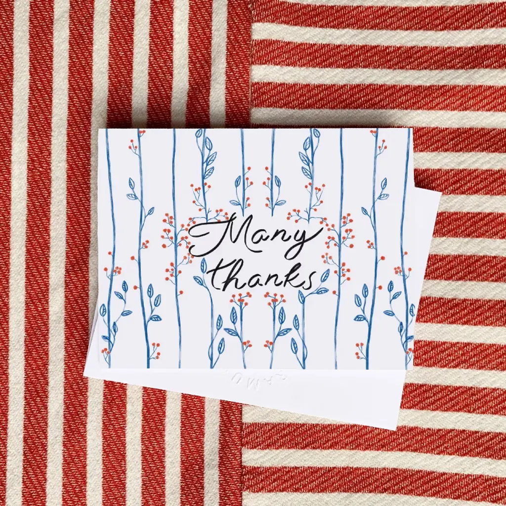 This 3-pack of Thank You greeting cards is elegantly illustrated by artist Ingrid Ramus, founder and owner of the Ramus & Co brand. Front artwork features "many thanks" winter flowers. The cards are blank inside. All greeting cards are made in the USA on heavyweight uncoated and locally-manufactured card stock. Each card is individually wrapped in TUV Austria certified-compostable PLA sleeves. Each card is accompanied by a hand-embossed envelope made with heavyweight 95lb paper and a peel-and-stick flap - no licking envelopes here! All Ramus & Co. greeting cards are printed on FSC and SFI certified paper sourced from a regional mill that harnesses 66% of its energy from on-site sustainable sources, such as emission-free hydroelectricity and biomass co-generation from wood waste. Additionally, our greeting cards are thoughtfully packaged in bags made from certified compostable PLA material. Husband-and-wife team Calvin and Ingrid Ramus founded Ramus & Company in 2019, in New England, USA. Ingrid, the creative designer behind the brand, originates from Mexico, where she cultivated her skills in fashion and textile design. Drawing from her unique and inquisitive perspective on preppy style, Ingrid prolifically designs whimsical yet classic stationery and lifestyle items.