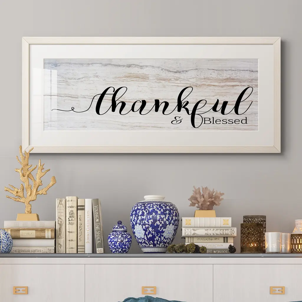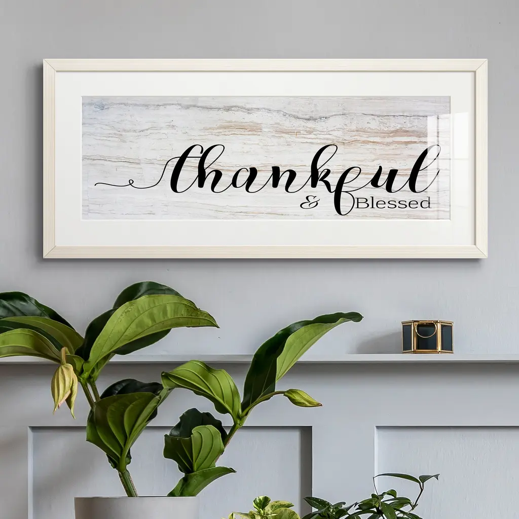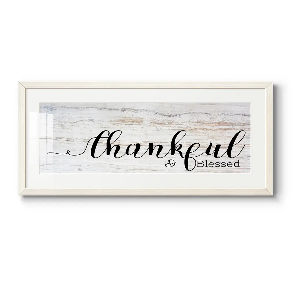 Thankful & Blessed-Premium Gallery Framed Print - Ready to Hang A Premium Framed Print created to last. Framed in distressed wood and available in an array of sizes and colors Featuring a beveled a solid wood stretcher bar, each piece comes ready to hand 1 SIZE AVAILABLE 12''X28'' - Overall Size Each piece is made to order. Each piece comes with hanging hardware. Made in the USA Ready to Hang Giclee Paper Print Acrylic Glass Beveled Matt Board