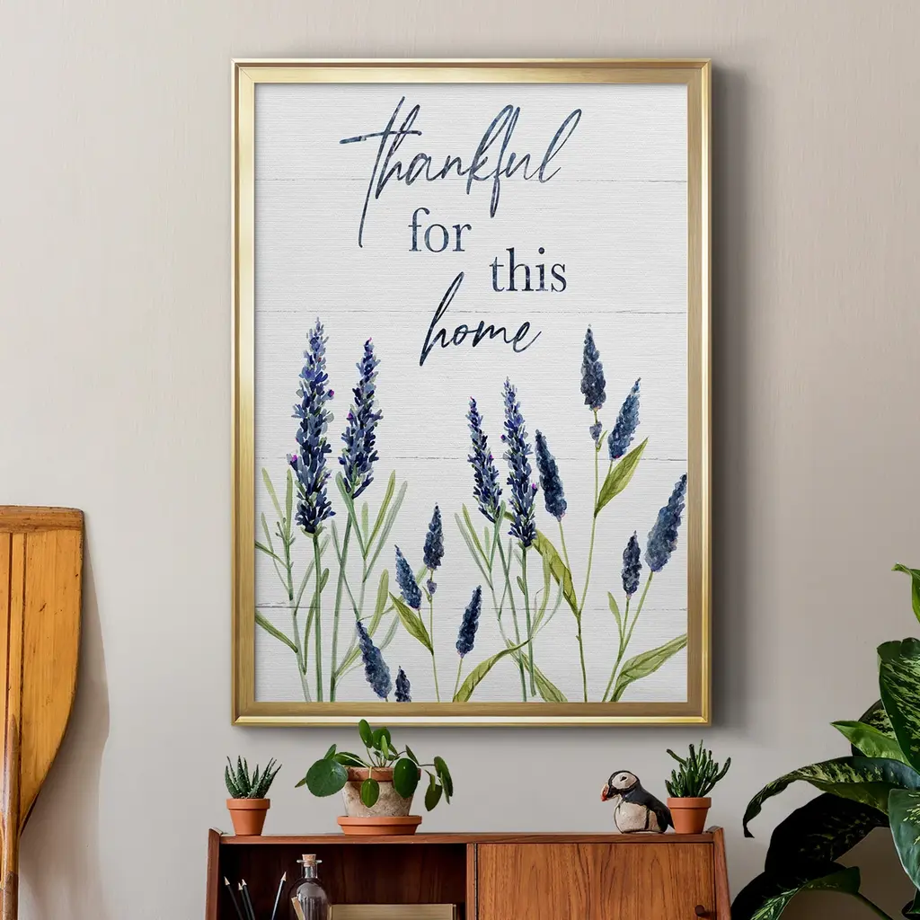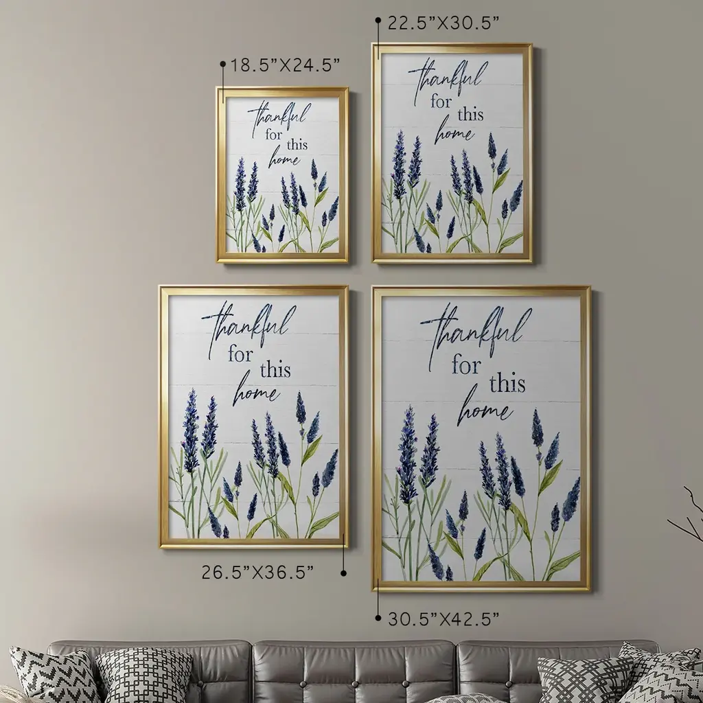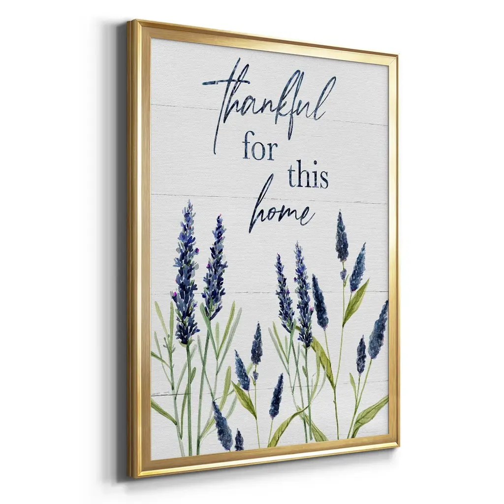 Thankful for this Home Premium Framed Print - Ready to Hang A Premium Framed Print created to last. Framed in distressed wood and available in an array of sizes and colors Featuring a beveled a solid wood stretcher bar, each piece comes ready to hand 4 SIZES AVAILABLE 30.5''X42.5'' - Overall Size 26.5'X36.5'' - Overall Size 22.5''x30.5'' - Overall Size 18.5''x24.5'' - Overall Size Each piece is made to order. Each piece comes with hanging hardware. Made in the USA Ready to Hang