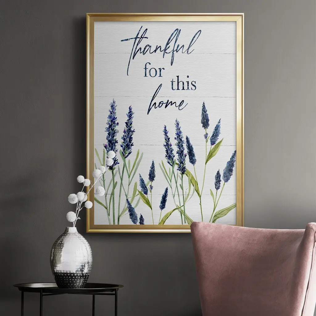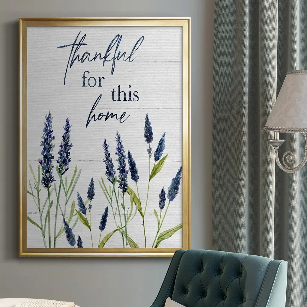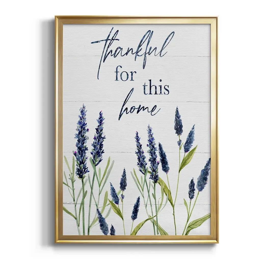 Thankful for this Home Premium Framed Print - Ready to Hang A Premium Framed Print created to last. Framed in distressed wood and available in an array of sizes and colors Featuring a beveled a solid wood stretcher bar, each piece comes ready to hand 4 SIZES AVAILABLE 30.5''X42.5'' - Overall Size 26.5'X36.5'' - Overall Size 22.5''x30.5'' - Overall Size 18.5''x24.5'' - Overall Size Each piece is made to order. Each piece comes with hanging hardware. Made in the USA Ready to Hang
