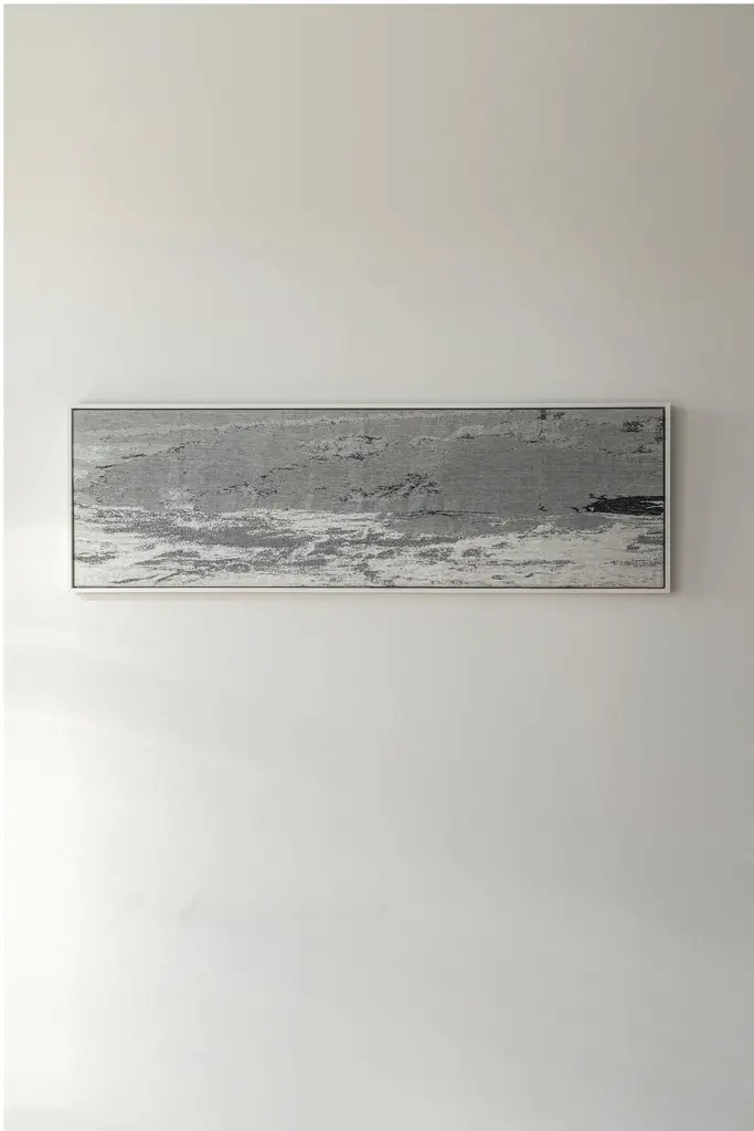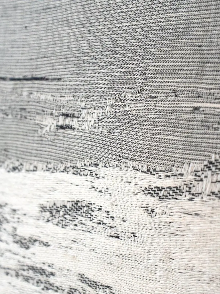 That Was Yesterday by Natalie Van der Massen Dimensions: 155 x 50 cmMaterials: Linen, Bio Cotton. Color white, grey, blackTechnique: Manually woven. Hand-crafted. Painted. That Was Yesterday is a unique piece manually woven and painted, with different textures and cool colors that accents every room, inspired by landscape paintings. Designer's BiographyNathalie Van der Massen (°88) is a designer working in the field of textile and graphic design, interior, and architecture. After finishing her Master in Graphic Design at Sint Lucas Antwerp, she went to LUCA Ghent for a 2nd degree in Textile Design. During this study period, she was selected for a residency at the Textile Museum in Tilburg and did internships with an Italian fashion company in Como and later with fashion designer Christian Wijnants. In 2016 Van der Massen is asked to conduct research and exhibition commissioned by the Flemish Architecture Institute (VAi). This experience was very important for the further evolution of her practice. In 2018 she takes the leap as a full-time designer with the establishment of her own design studio and the launch of her first collection. Nathalie's work is characterized by interest and sensitivity for (natural) materials, surface, and technicality. Her work is exploring the (industrial) production method of textiles and its potential as an autonomous, spatial and acoustic element in an architecture or living environment.