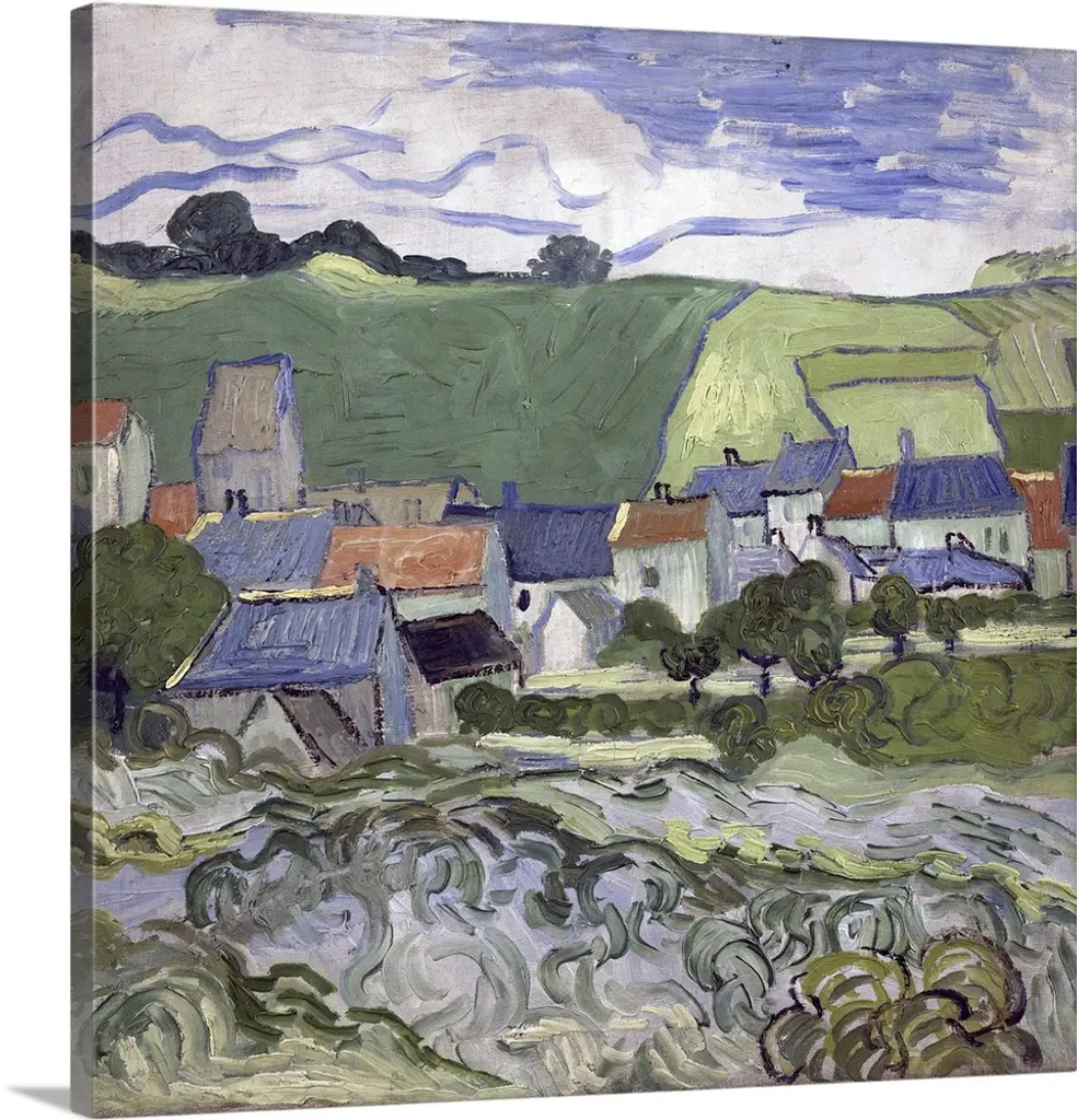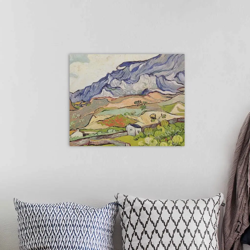 Large, landscape, classic painting of the Alpilles mountains looming over a farming landscape of fields, houses and a single road. Painted in swirling, directional brushstrokes.