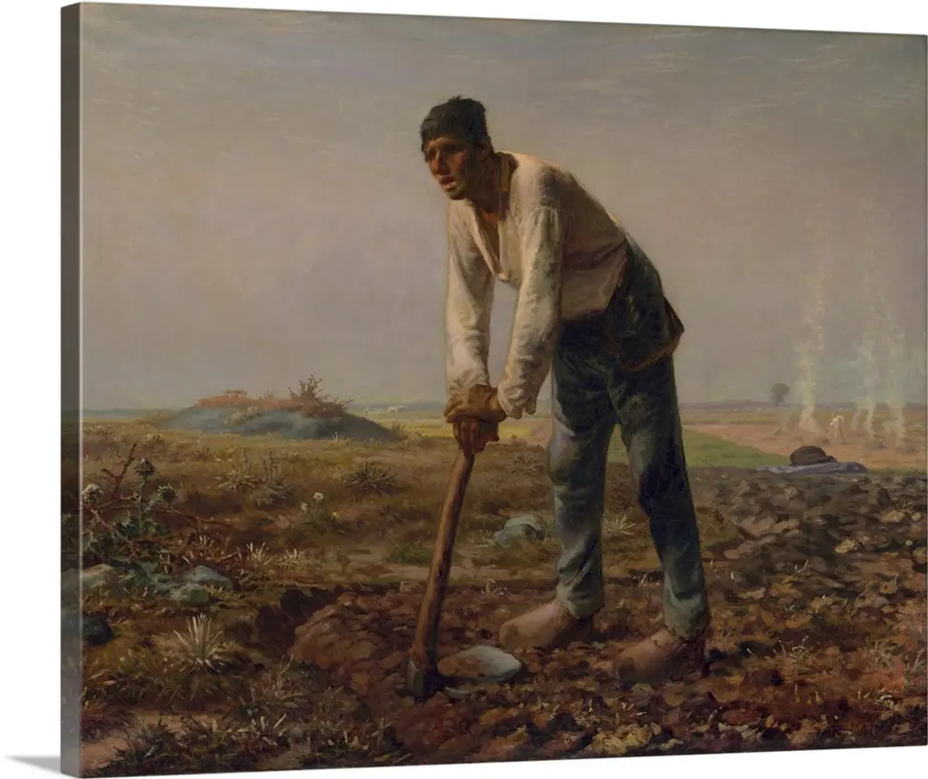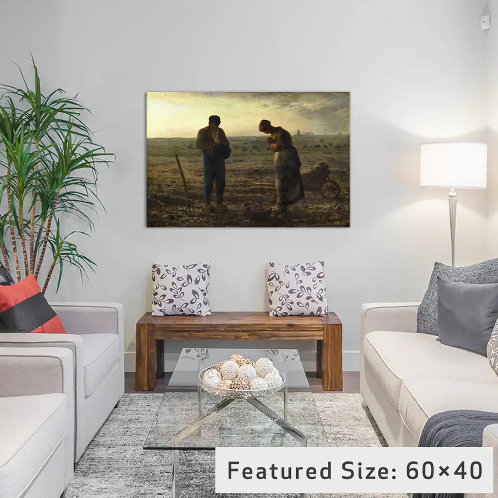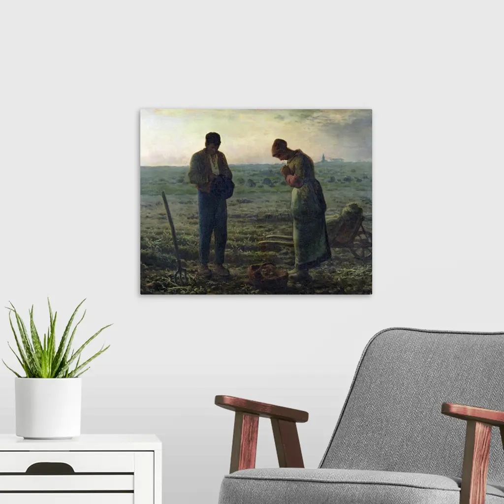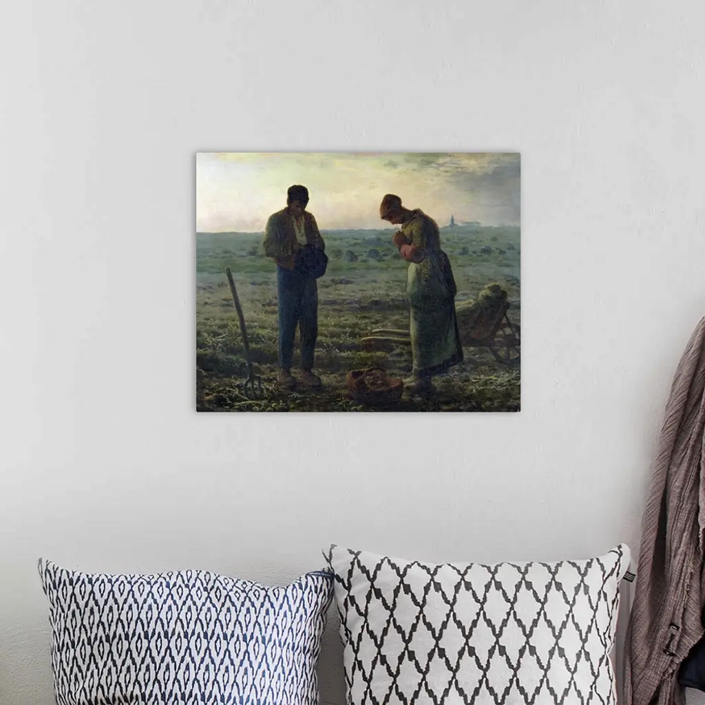 "The Angelus" is a prayer prayed at dawn, mid-day, and dusk. The painting depicts a wife bringing her husband his mid-day meal in the field. We can almost hear the bells from the church in the background calling the faithful to prayer as the husband and wife stop to pray. It is a religious, specifically a Catholic work of art painted by Jean-Francois Millet beginning in 1857. There is a deeper meaning, however. When examined under x-ray a small coffin can be seen painted under the basket indicating that the couple is also praying for their lost infant. Millet completed the work in 1859. The original can be seen in the Musee d'Orsay in Paris.