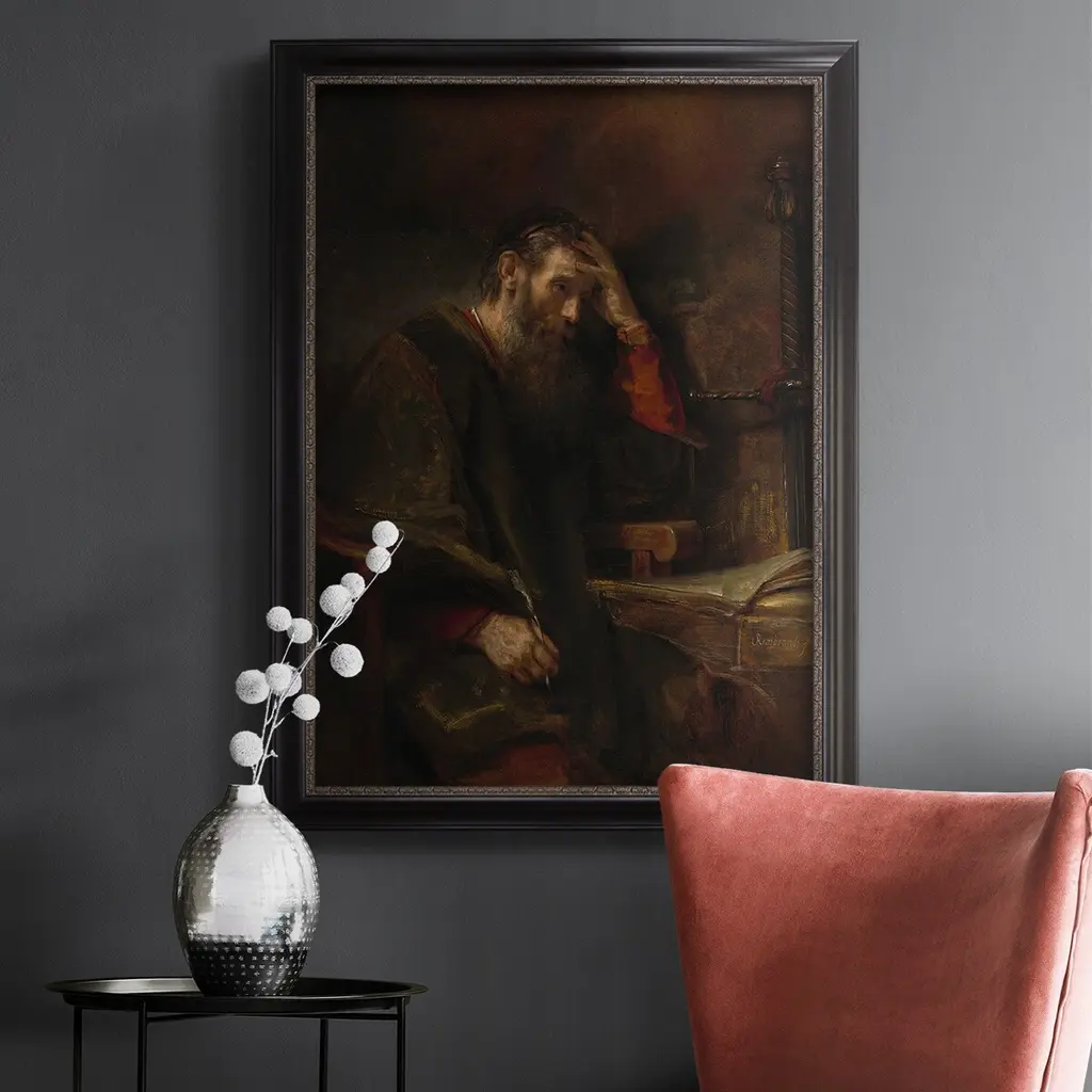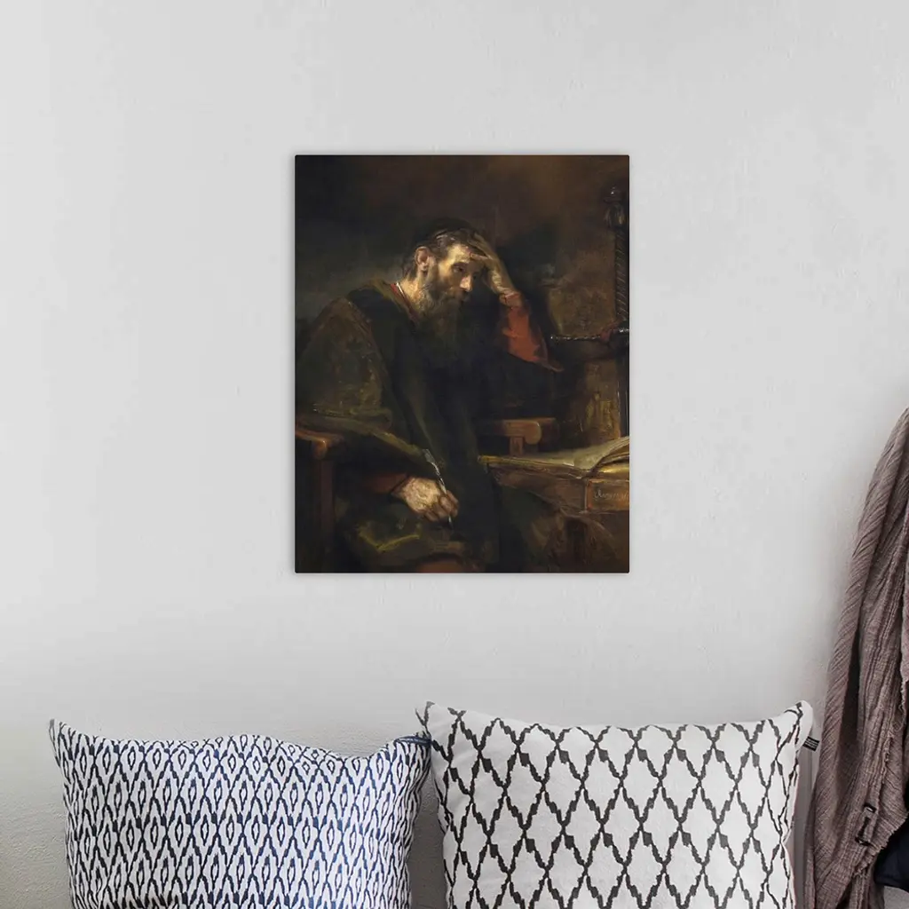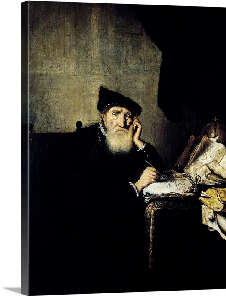 The Apostle Paul, by Rembrandt van Rijn, c. 1657, Dutch painting, oil on canvas. Meditative Paul at a table in his prison cell, holding a writing quill. Pertinent to the Protestant Dutch Republic, Paul?s writings were the most important source for Reforma