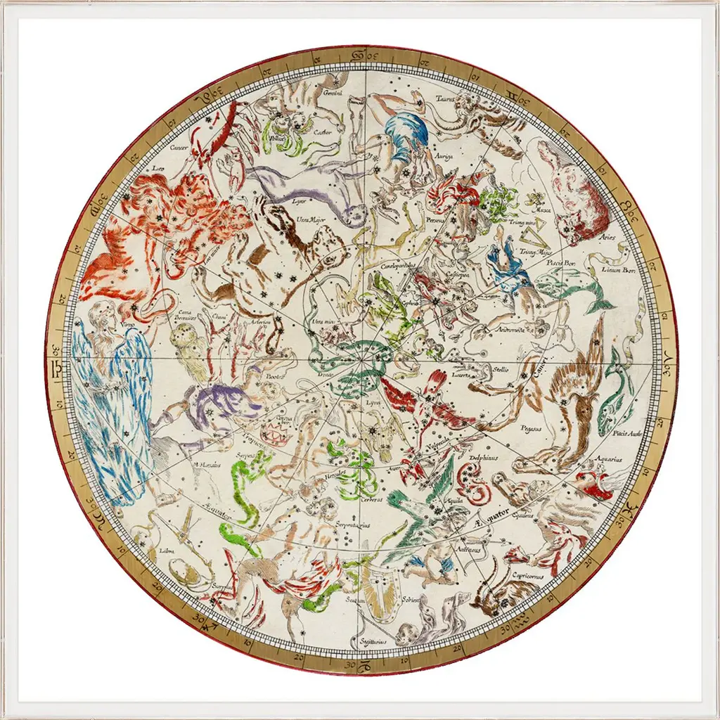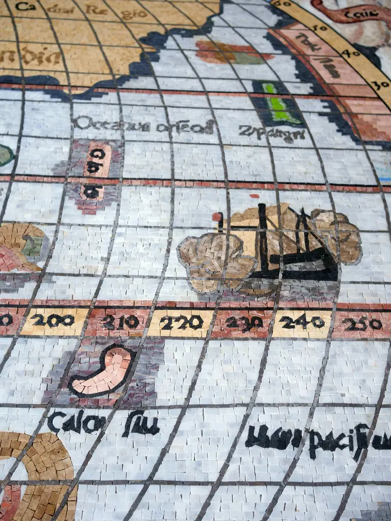 An exquisite mosaic artwork, "Celestial Cartography," presents a captivating depiction of the world embraced by the heavens. The artist masterfully employs the tesserae technique, meticulously arranging tiny fragments of colored glass, stone, or ceramic to form a detailed and vibrant map. The terrestrial features of continents and oceans are rendered with precision, showcasing the intricate style where the tesserae are closely spaced for a smooth and refined surface.Adding a celestial dimension to the composition, angelic figures emerge from swirling clouds, their wings outstretched as if supporting the very sphere of the world. This divine presence imbues the map with a sense of wonder and the interconnectedness of the earthly and heavenly realms. The artist's skillful use of flow and direction of the tesserae – creates a dynamic sense of movement within the piece, drawing the viewer's eye across the continents and up towards the celestial figures.