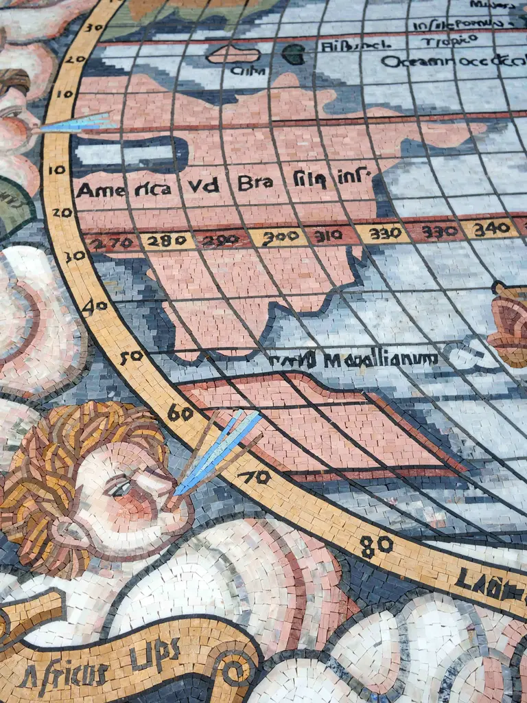 An exquisite mosaic artwork, "Celestial Cartography," presents a captivating depiction of the world embraced by the heavens. The artist masterfully employs the tesserae technique, meticulously arranging tiny fragments of colored glass, stone, or ceramic to form a detailed and vibrant map. The terrestrial features of continents and oceans are rendered with precision, showcasing the intricate style where the tesserae are closely spaced for a smooth and refined surface.Adding a celestial dimension to the composition, angelic figures emerge from swirling clouds, their wings outstretched as if supporting the very sphere of the world. This divine presence imbues the map with a sense of wonder and the interconnectedness of the earthly and heavenly realms. The artist's skillful use of flow and direction of the tesserae – creates a dynamic sense of movement within the piece, drawing the viewer's eye across the continents and up towards the celestial figures.