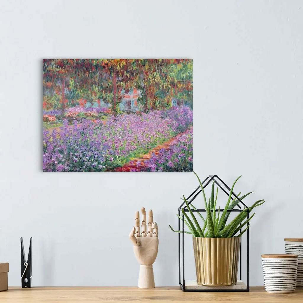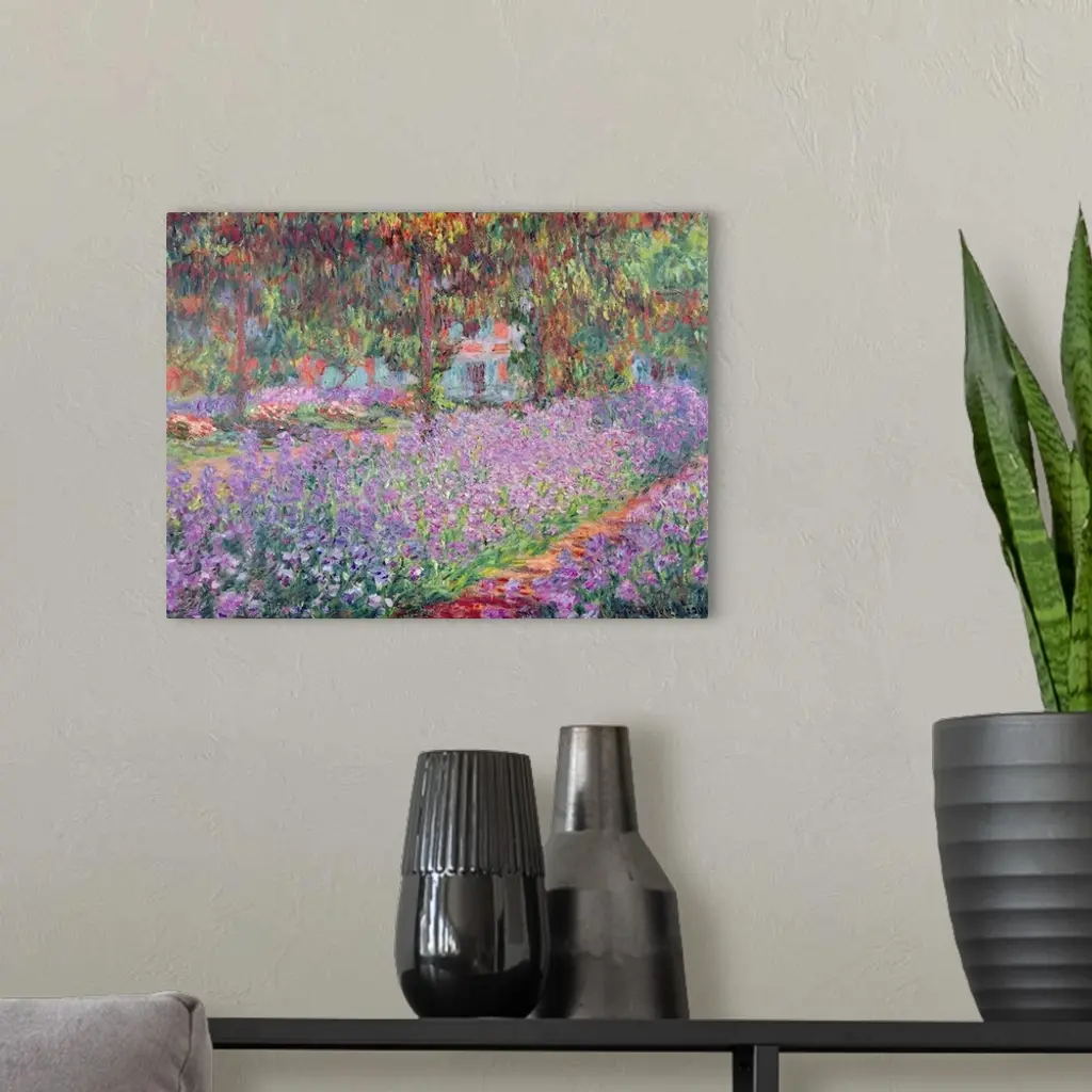Giant classic art painting showcasing a beautiful garden filled with flowers and surrounding trees.