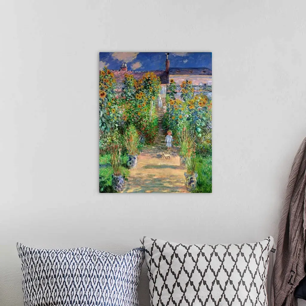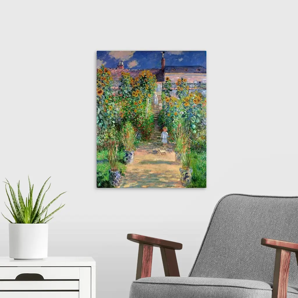 Classical oil painting of child wondering down dirt pathway lined with sunflowers and tall grass under a cloudy sky.