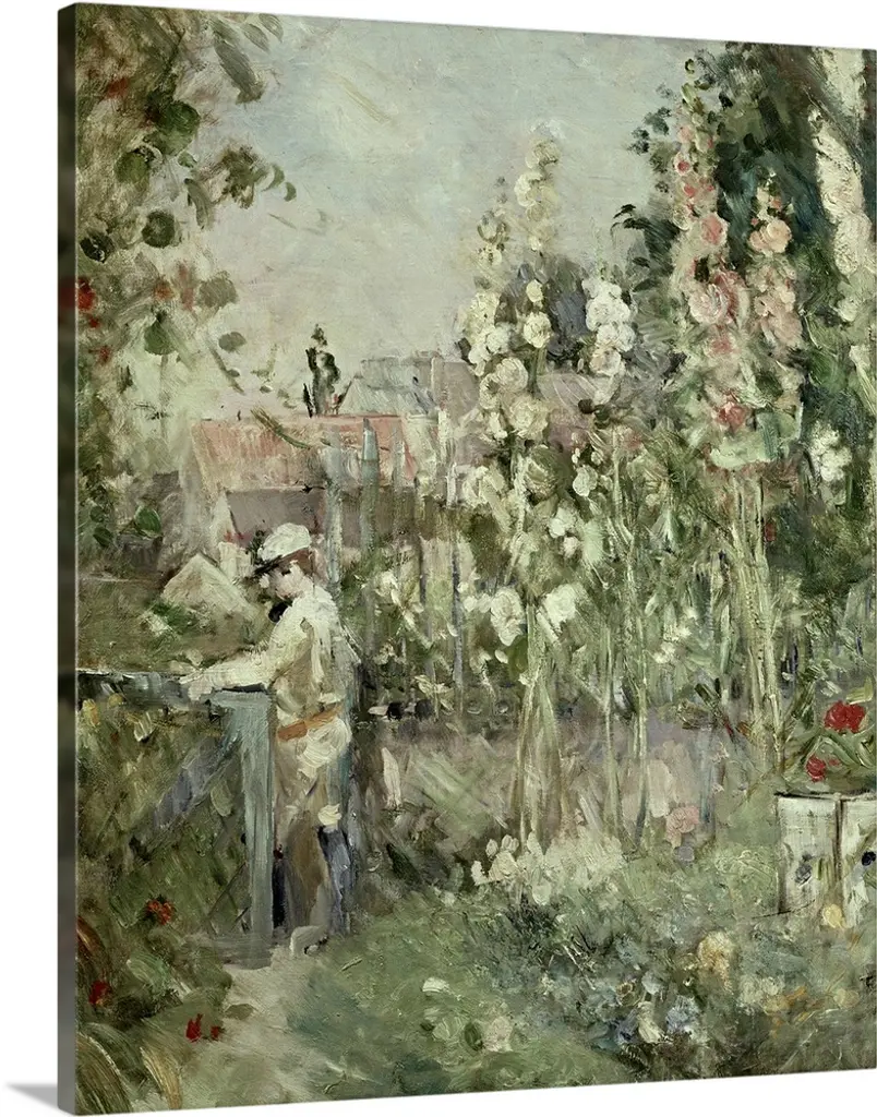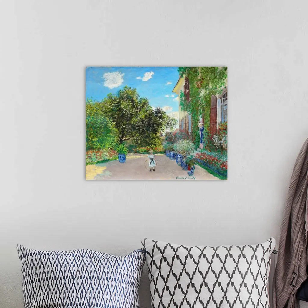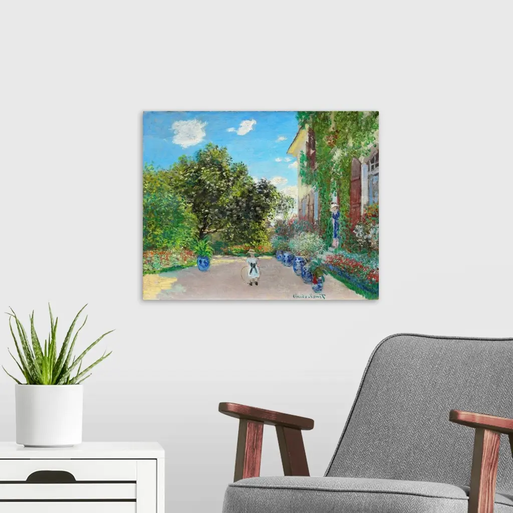 Claude Monet and his family lived at Argenteuil, outside Paris, from 1871 to 1878. Here he depicted his five- or six-year-old son, Jean, playing with a hoop and his wife, Camille, standing in the doorway of their vine-covered house. The pleasant weather and neatly kept garden, a forerunner of the artist's celebrated garden at Giverny, give a sense of tranquility and well-being to this painting. This was a period of financial security for Monet thanks to recent sales of his work to the Paris art dealer Paul Durand-Ruel.