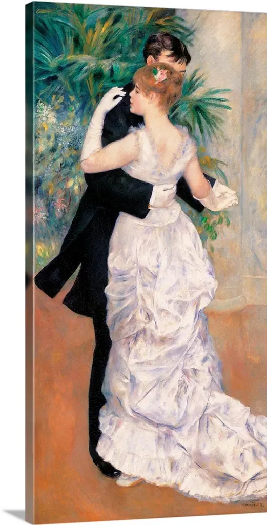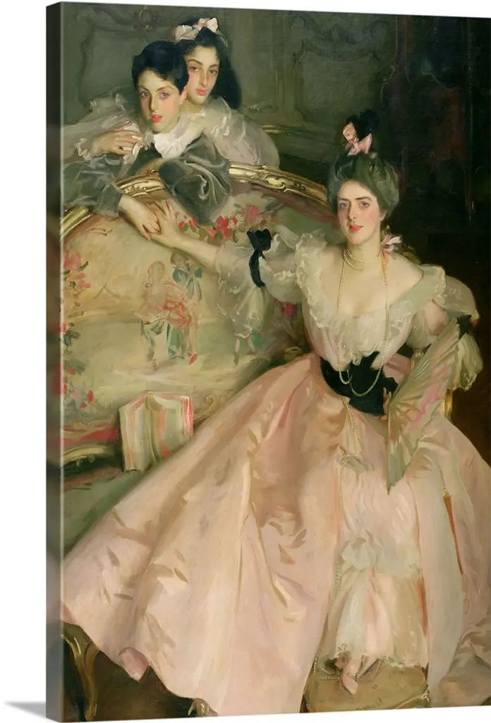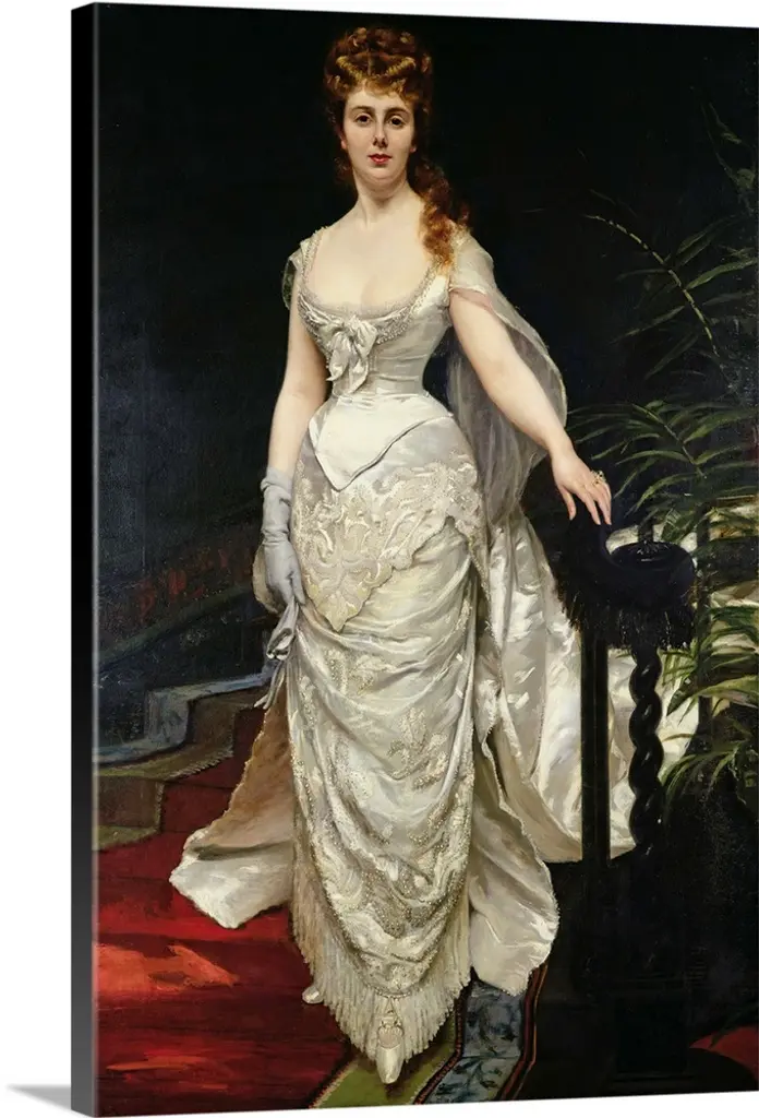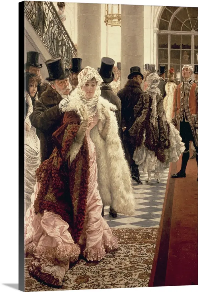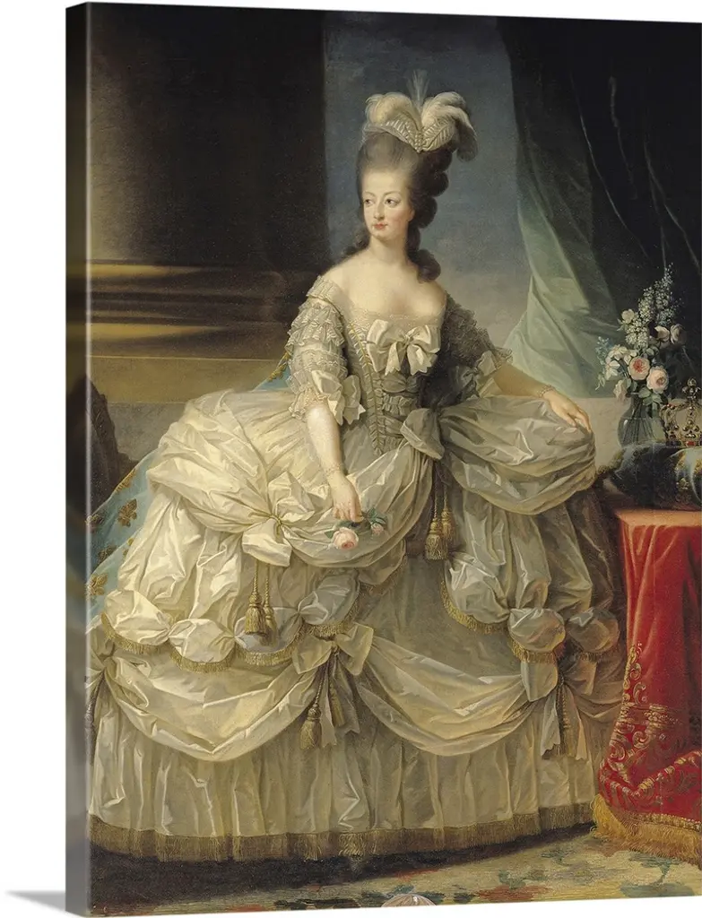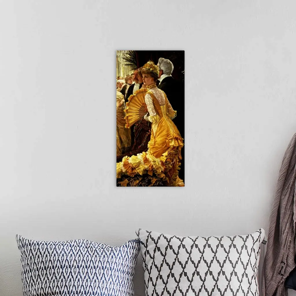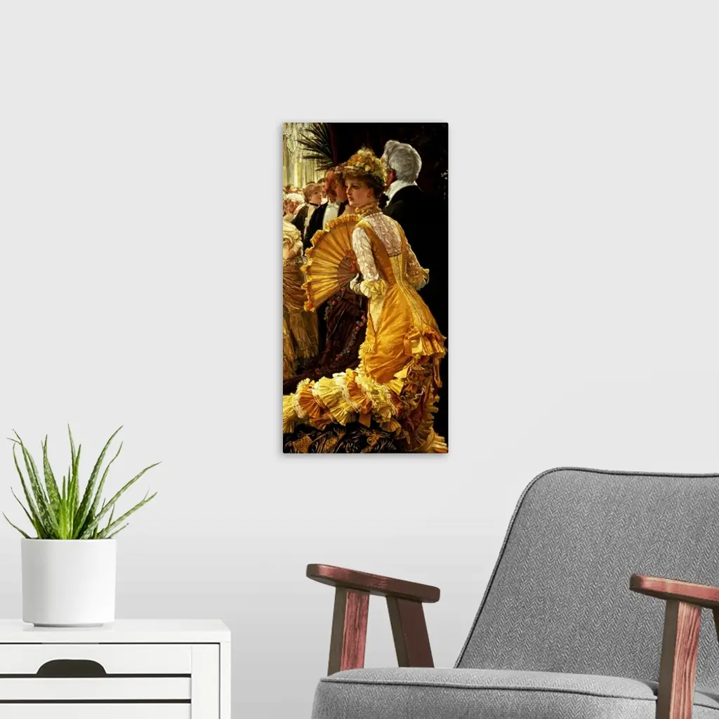 Vertical, large wall painting of a woman dressed in an elaborate, ruffled gown and headpiece, holding a fan as she looks out onto a vast crowd at a ball.
