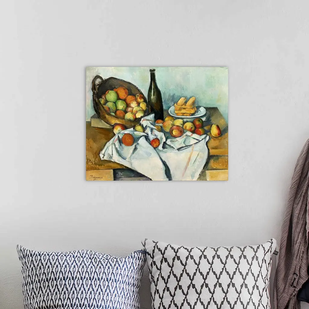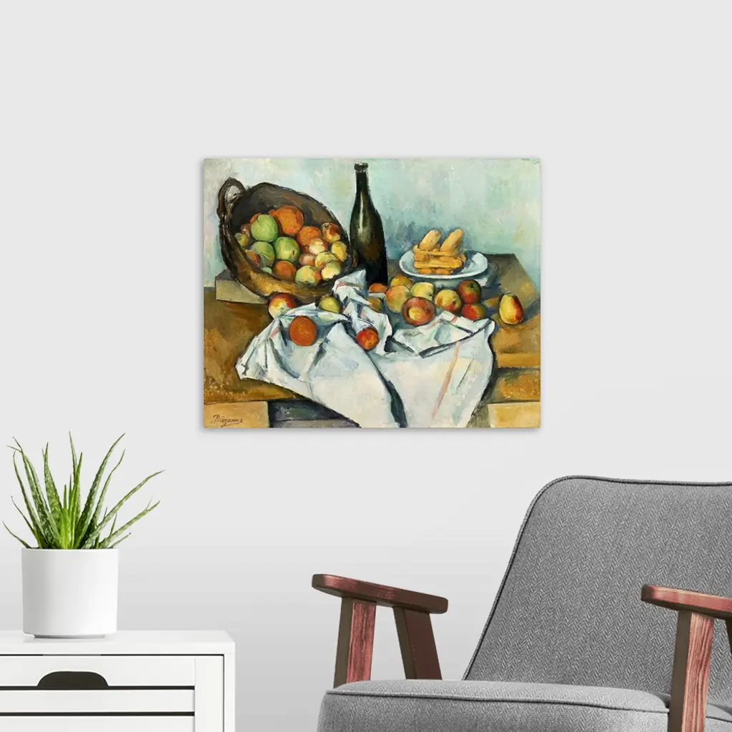 Art, Paul Cezanne once claimed, is "a harmony running parallel to nature," not an imitation of nature. In his quest for underlying structure and composition, he recognized that the artist is not bound to represent real objects in real space. Thus, The Basket of Apples, contains one of his signature tilted tables, an impossible rectangle with no right angles. On it, a basket of apples pitches forward from a slablike base, seemingly balanced by the bottle and the tablecloth's thick, sculptural folds. The heavy modeling, solid brushstrokes, and glowing colors give the composition a density and dynamism that a more realistic still life could never possess. This painting, one of Cezanne's rare signed works, was part of an important exhibition urged on the artist by the Parisian art dealer Ambroise Vollard in 1895. Since Cezanne had spent the majority of his career painting in isolation in his native Provence, this was the first opportunity in nearly twenty years for the public to see the work of the artist who is now hailed as the father of modern painting.