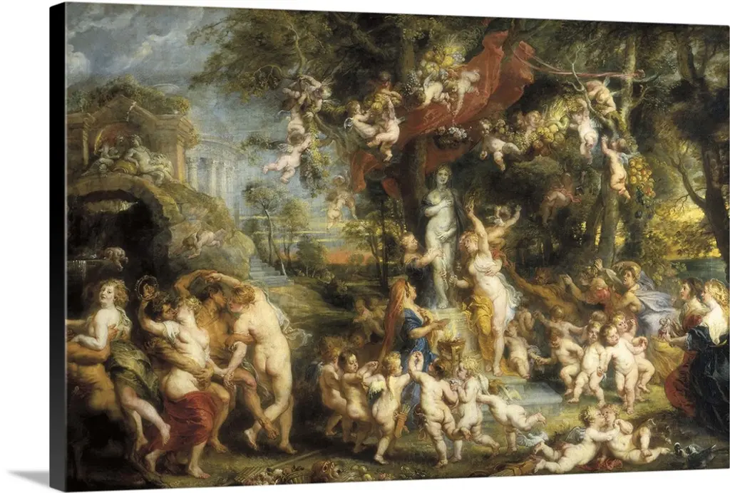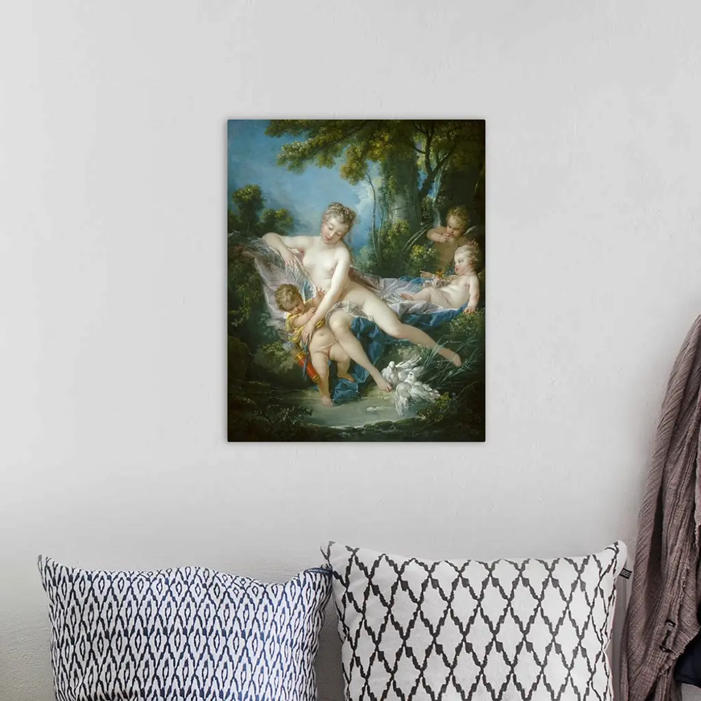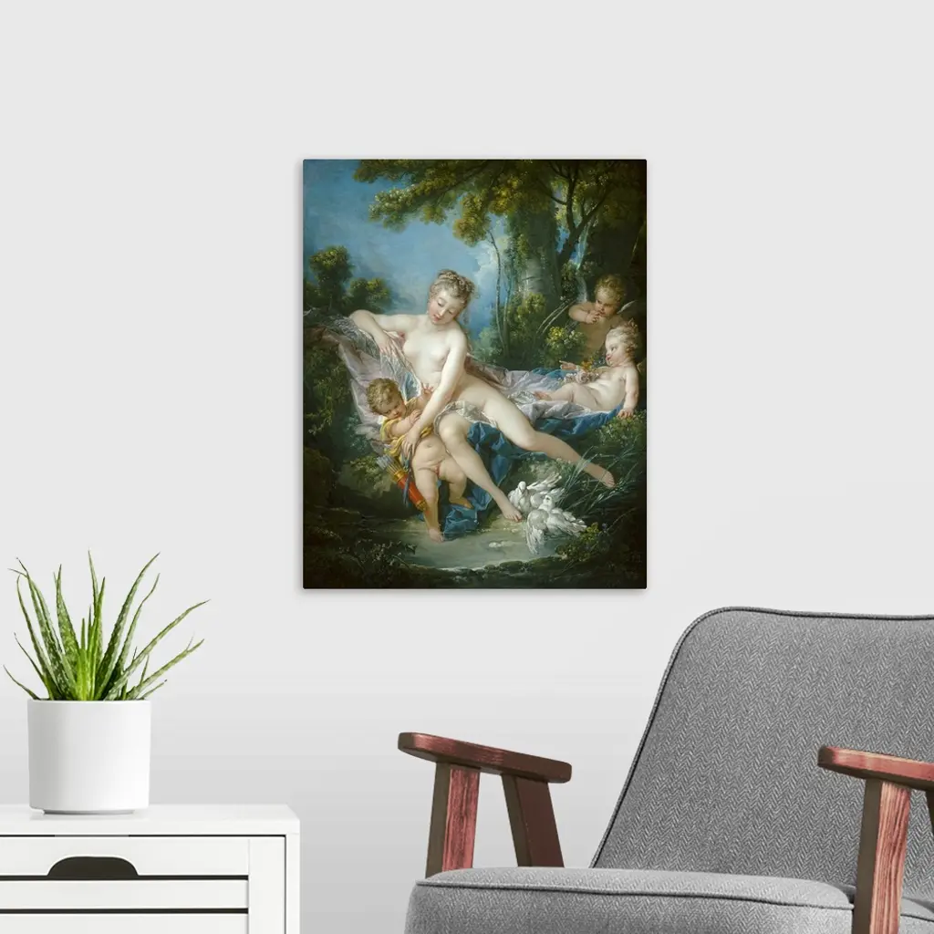 The Bath of Venus, by Francois Boucher, 1751, French painting, oil on canvas. In this painting, the goddess is depicted as an object of sensual beauty, in a lush garden setting, with a pouting Cupid, putti, and doves