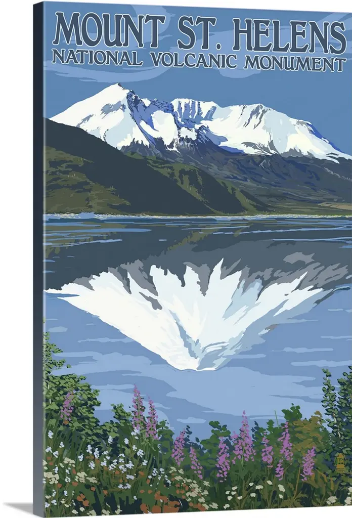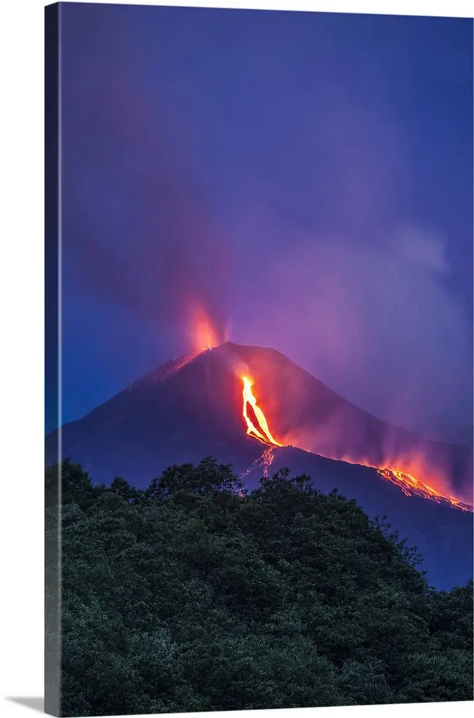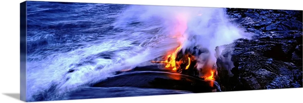 Retro stylized art poster of lava flow from a volcano spilling into the ocean.
