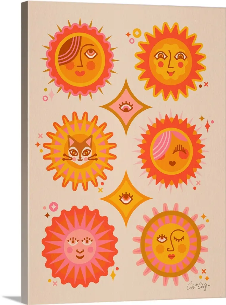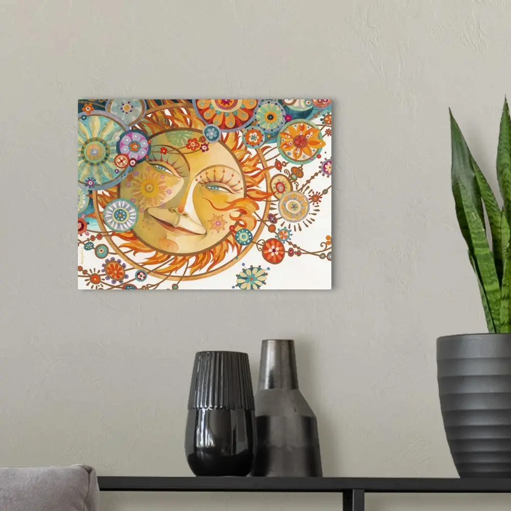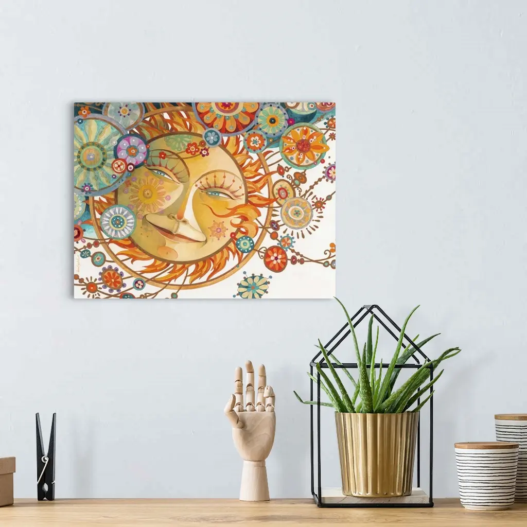 Contemporary artwork of a smiling sun with decorative baubles all around.