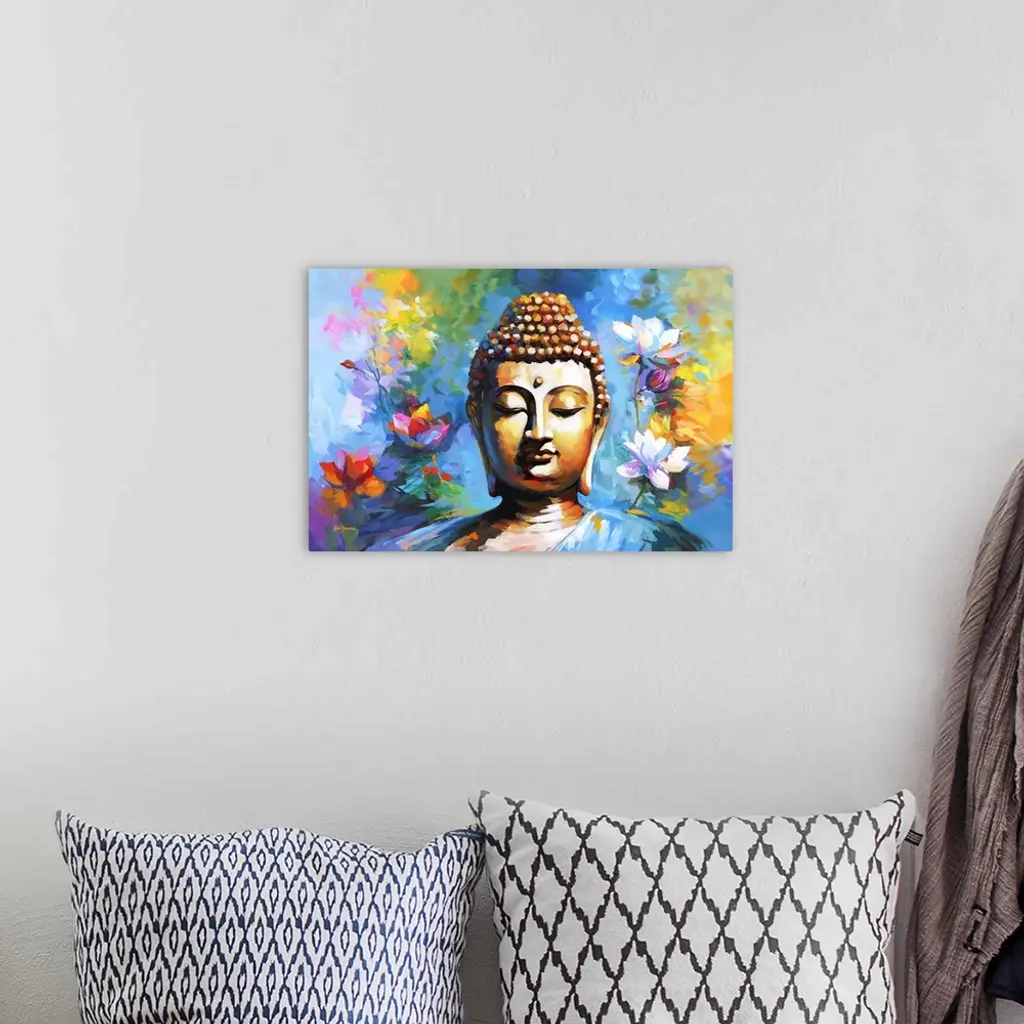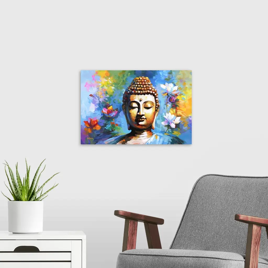 This contemporary artwork captures the serene essence of Buddha, enveloped by the vivid hues of abstract lotus flowers, merging zen tranquility with a burst of color. It's an ideal centerpiece to inspire a sense of peace and mindfulness in any living room.