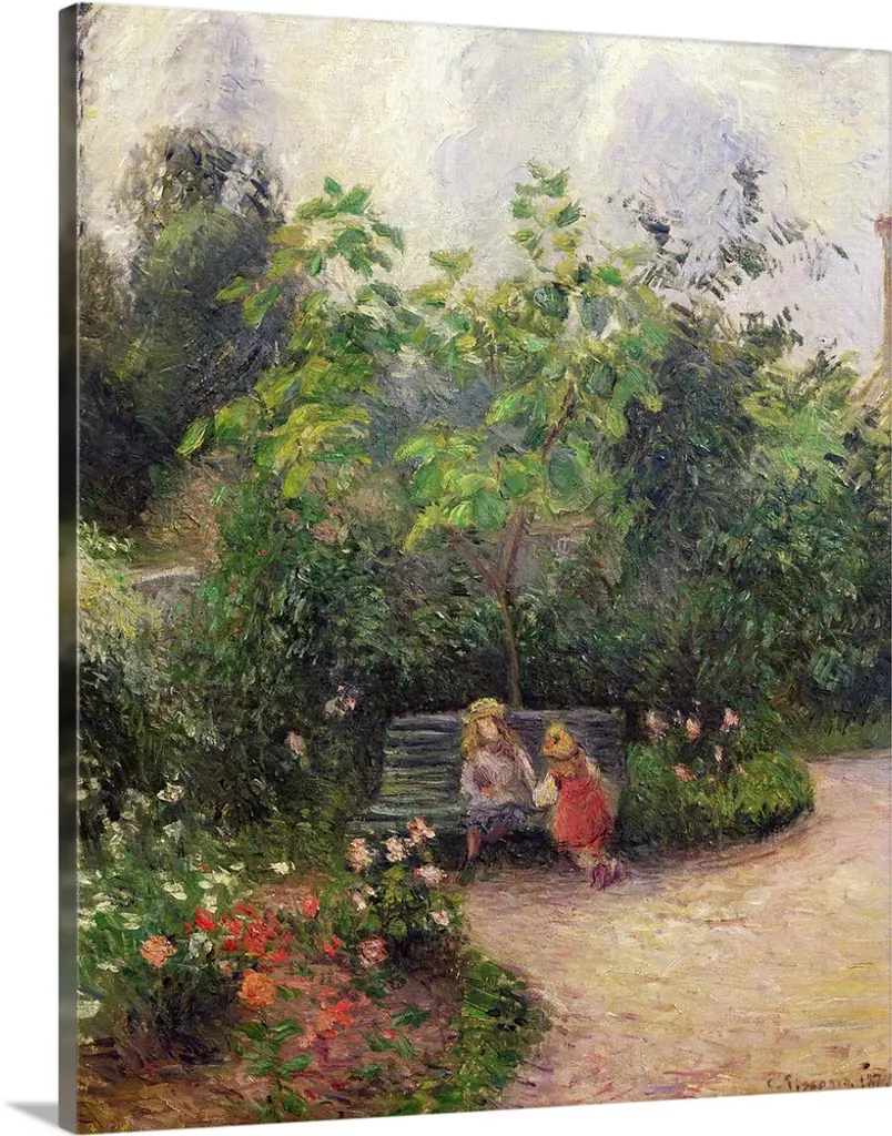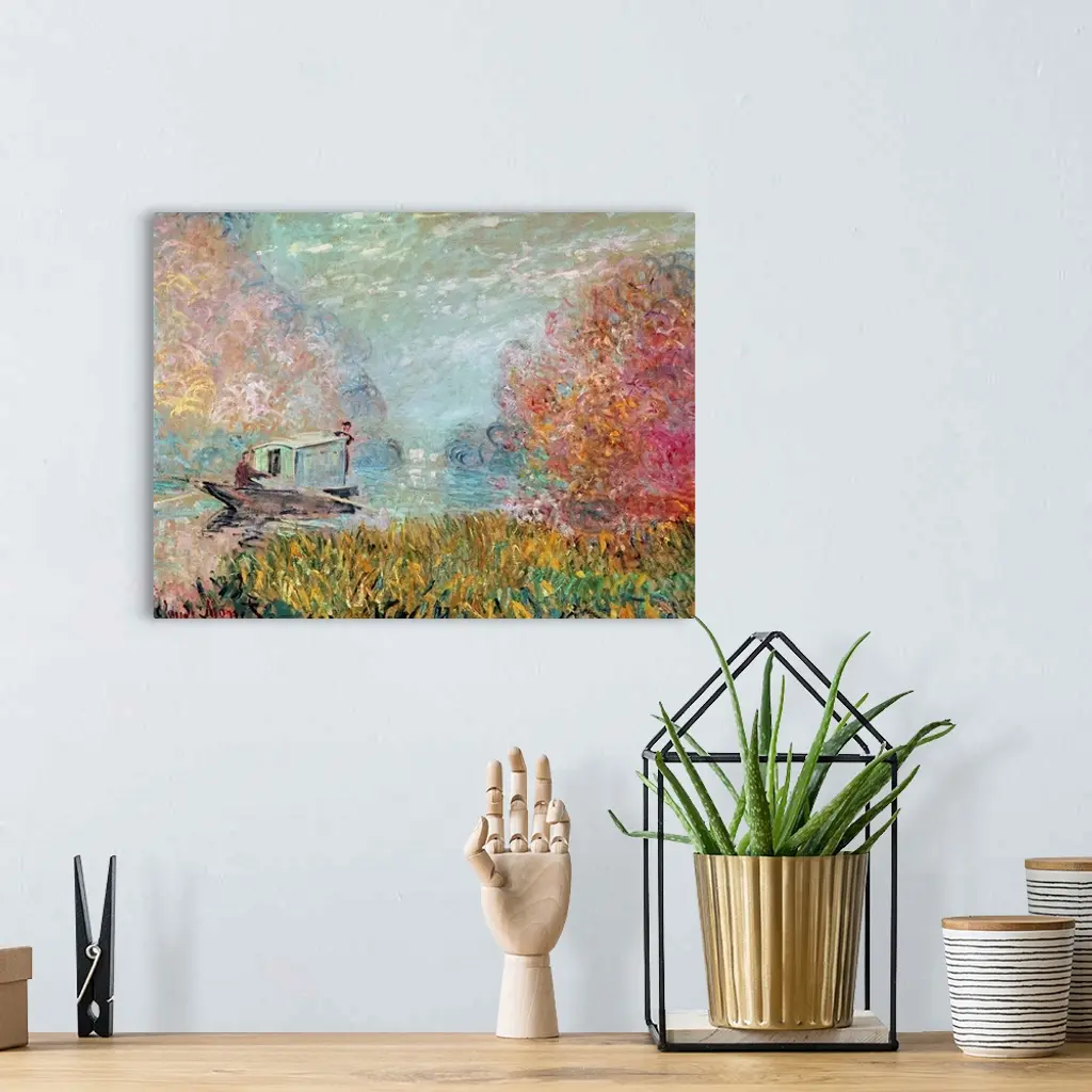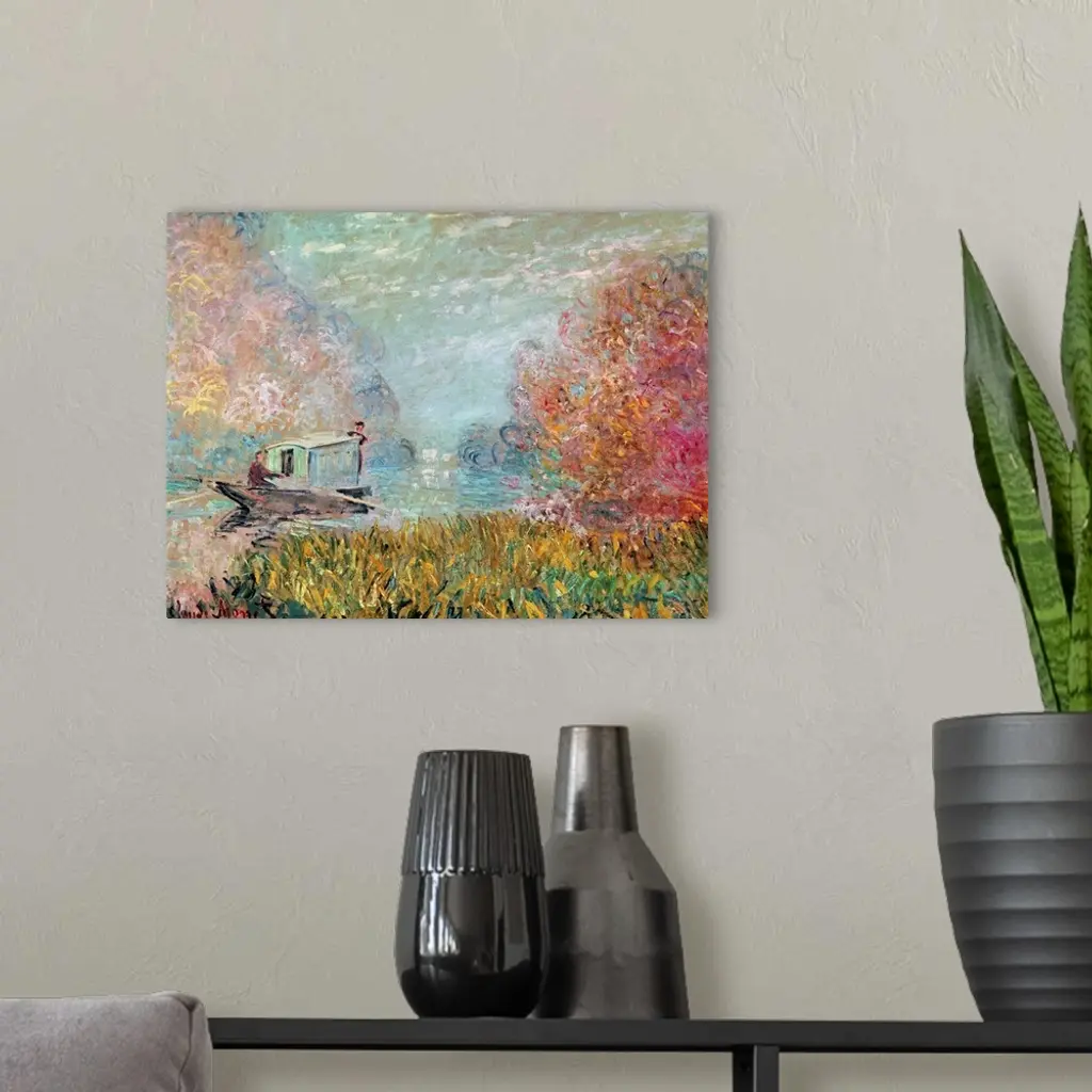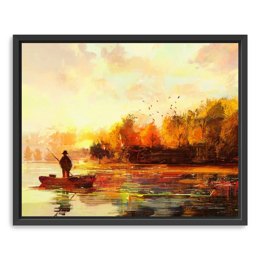 Classical painting of canoe floating downstream. The lake is lined with colorful trees and tall grass.