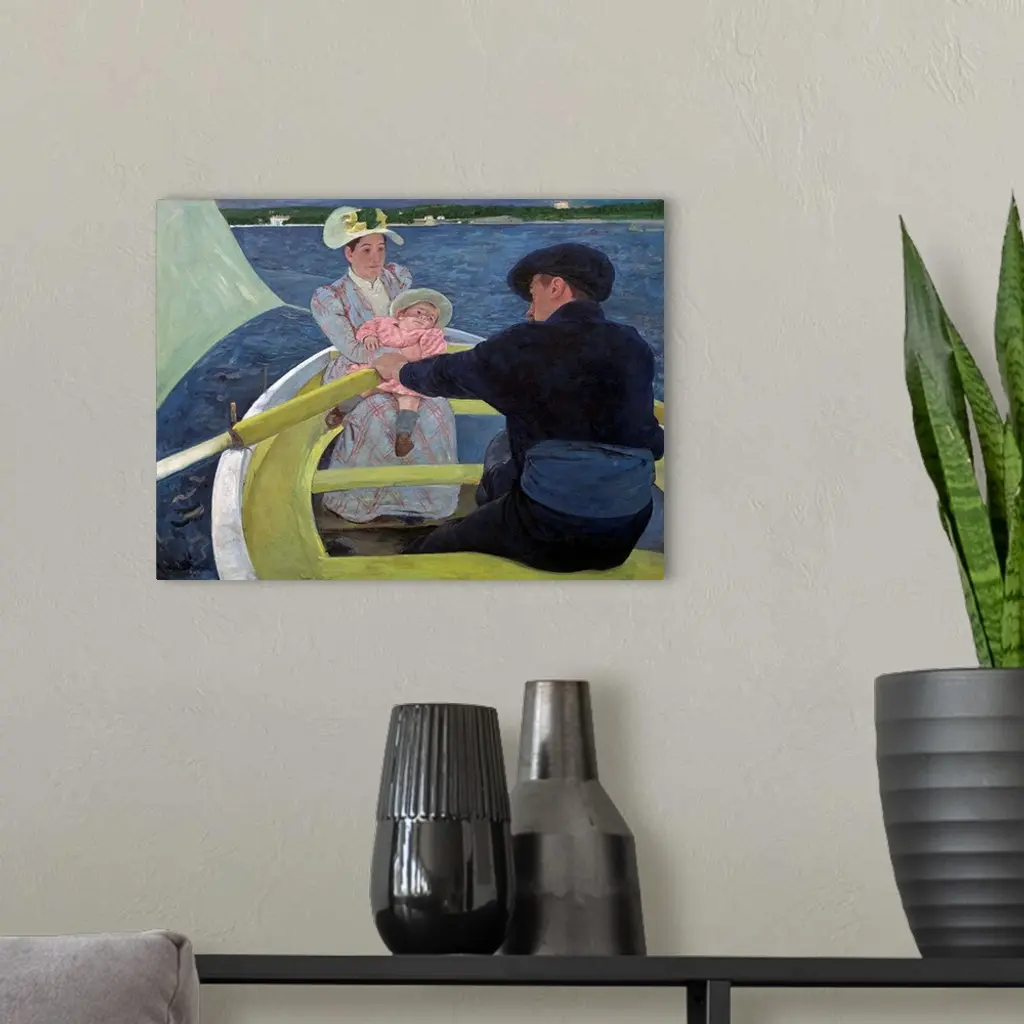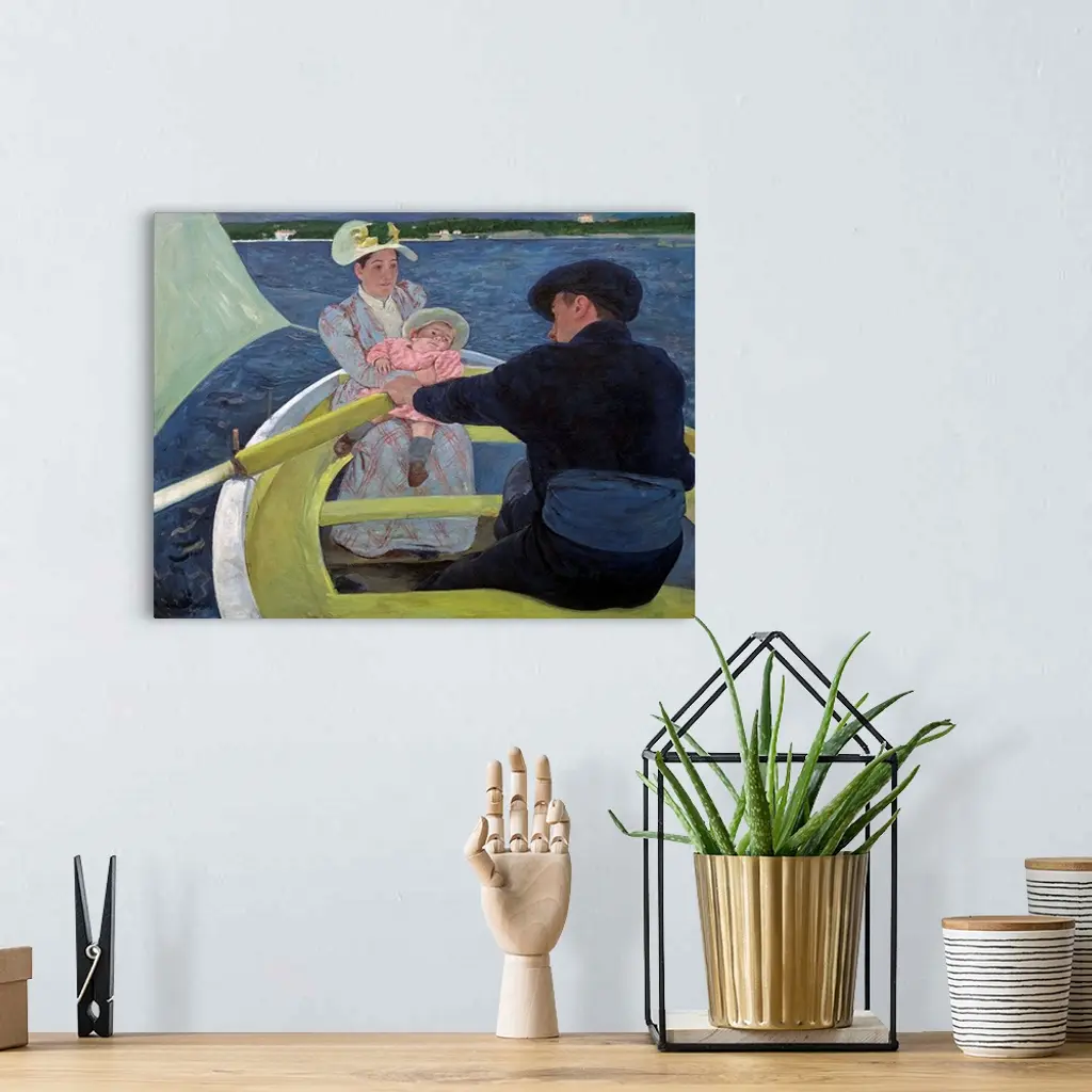 The Boating Party, by Mary Cassatt, 1893-94, American painting, oil on canvas. The bold geometry and surface patterning shows influence of post-impressionist painters. This painting was shown in Cassatt's first solo exhibition in the United States in 1895