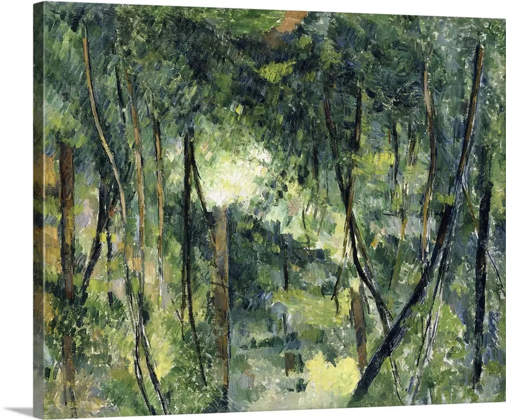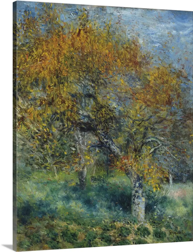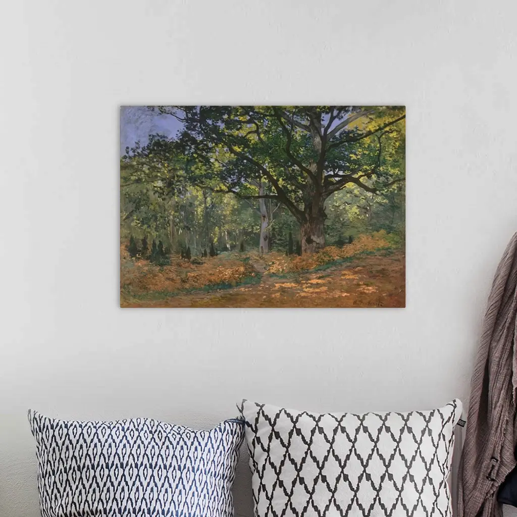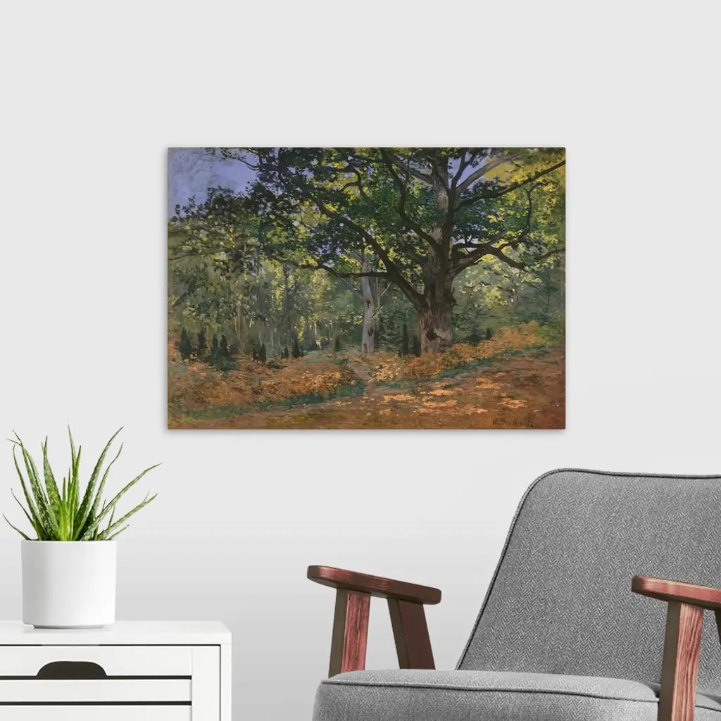 The Bodmer Oak was named after the Swiss artist Karl Bodmer (1809-1893), who exhibited his painting of the tree at the 1850 Salon. The carpet of russet leaves signals that Monet painted this view of the Fontainebleau forest just before he left nearby Chailly-en-Biere in October 1865. It is probably the last of several landscapes executed in connection with his monumental?Luncheon on the Grass?(Musee d'Orsay, Paris). The slash in the upper right-hand corner of the painting may have been made by Monet, who reputedly mutilated some canvases in order to discourage a landlord from seizing them in 1866.�