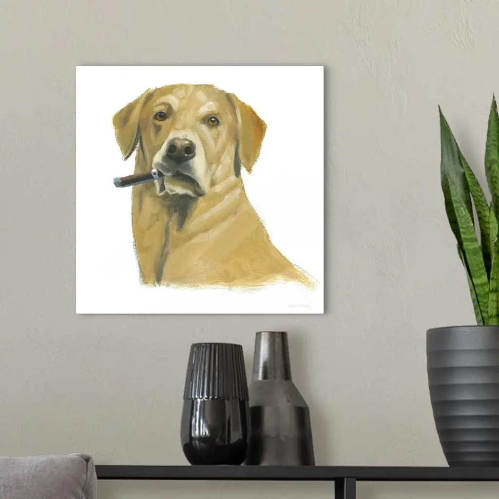 Square painting of a yellow lab smoking a cigar on a solid white background.