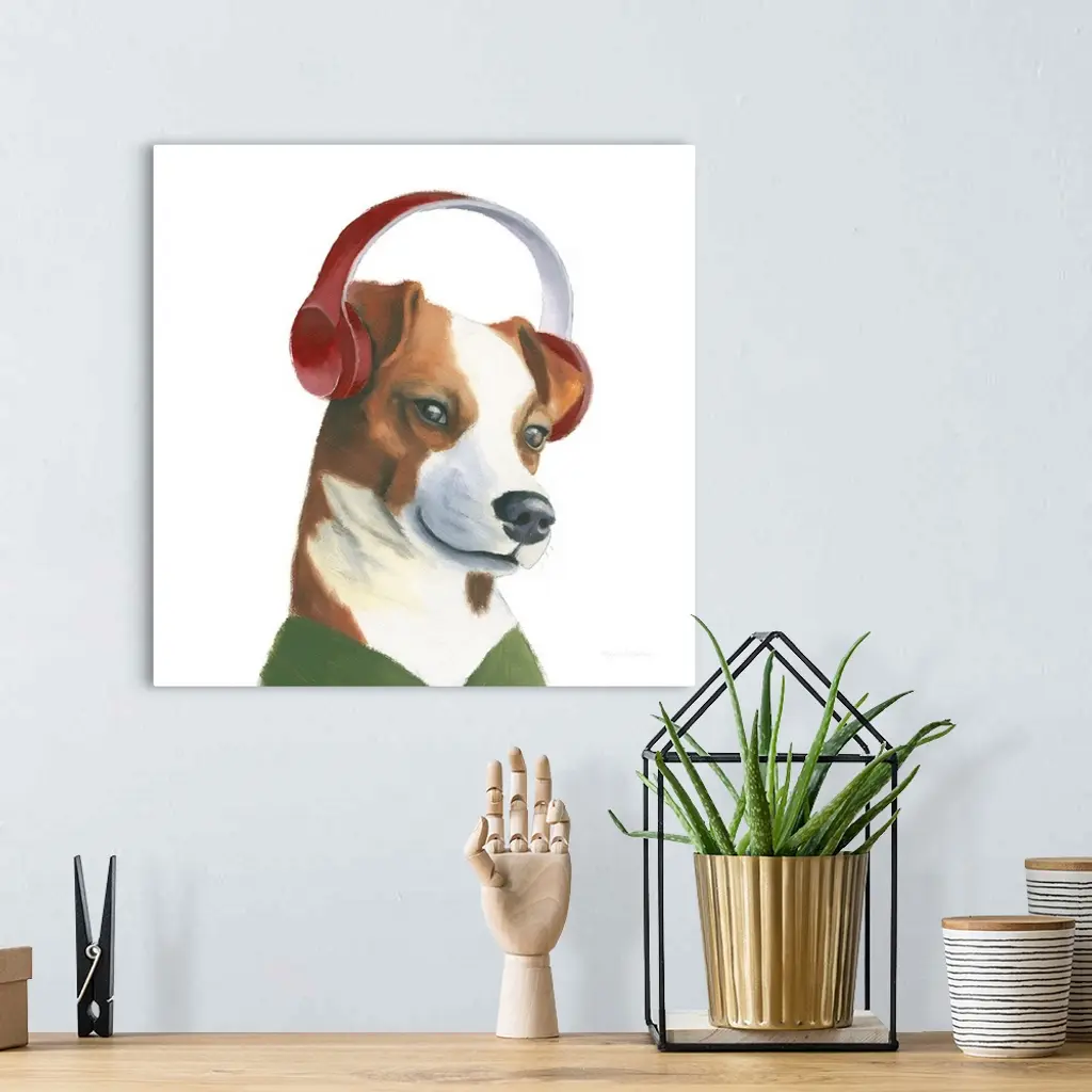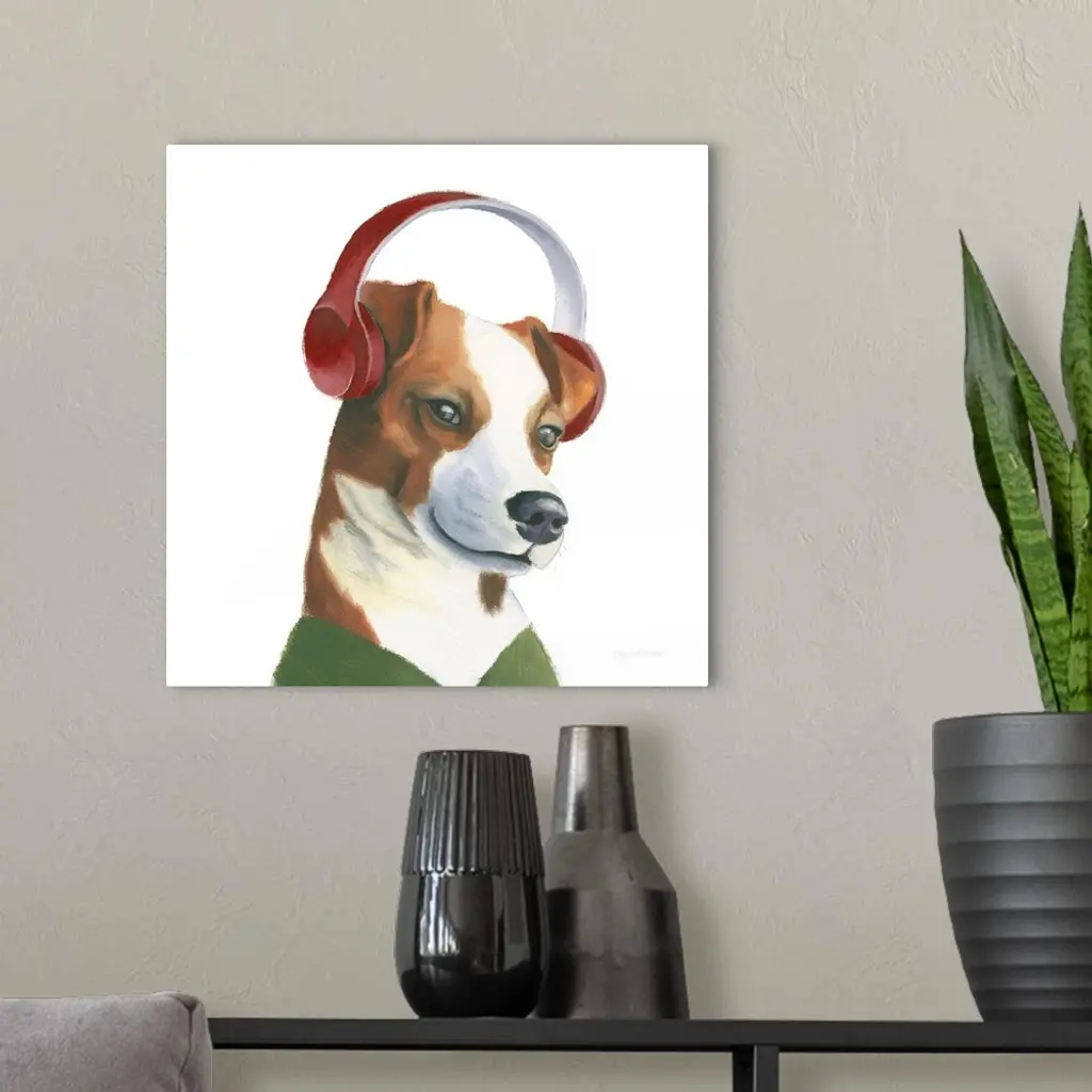 Square painting of a Jack Russel wearing red headphones and a green sweater.